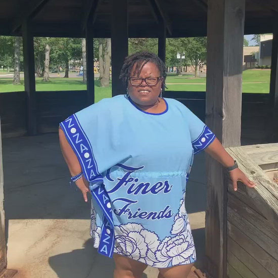 Heading toward the bright sky & blue water? Going on a cruise soon? This is a must have addition to your beach wear! Our "Finer Friends" beach cover-up designed for the Zeta Amicae member will keep you cool and covered for those fun days in the sun! Look at the beautiful print detail. Made with soft chiffon woven type material and has side seams for a stylish fit. Cover-ups are designed to have a looser fit but comes with a self-tie drawstring closure if you want to cinch it in more. Comes in one size fits most so we offer regular (up to 1XL) and plus size (2XL up to 4XL). You can wear with or without the drawstring. The short dolman style sleeves provides a little arm coverage, but not too much please! Match with your favorite swimsuit for an easy transition from the boardwalk to the beach. Wash in cold water and air dry or dry on low to keep this beauty perfect for many years to come. Wear it as cover-up or even a cute little summer number! It's so beautiful in person, every Zeta Amicae will want one! Secure yours by ordering today!