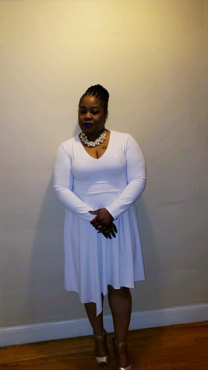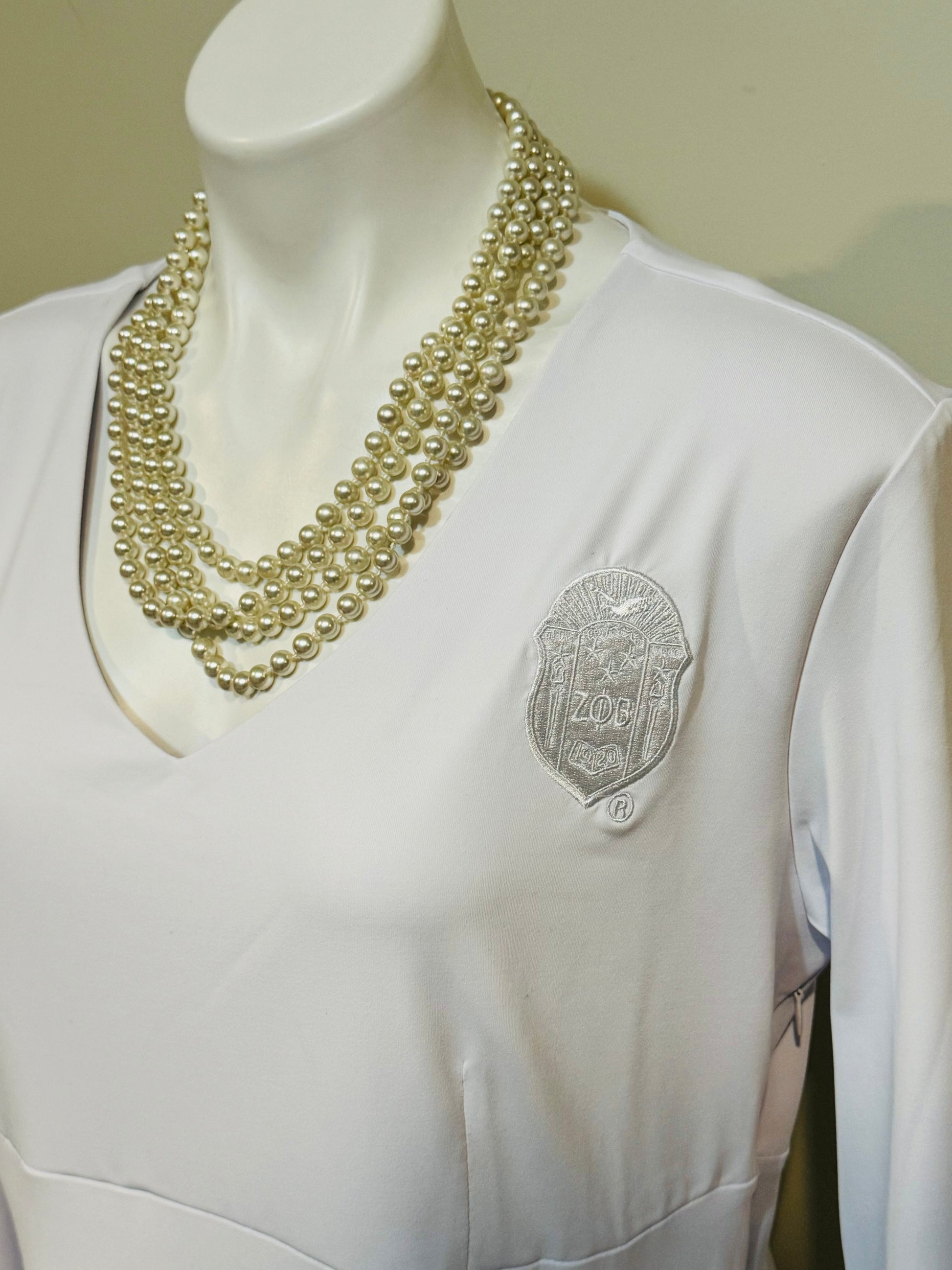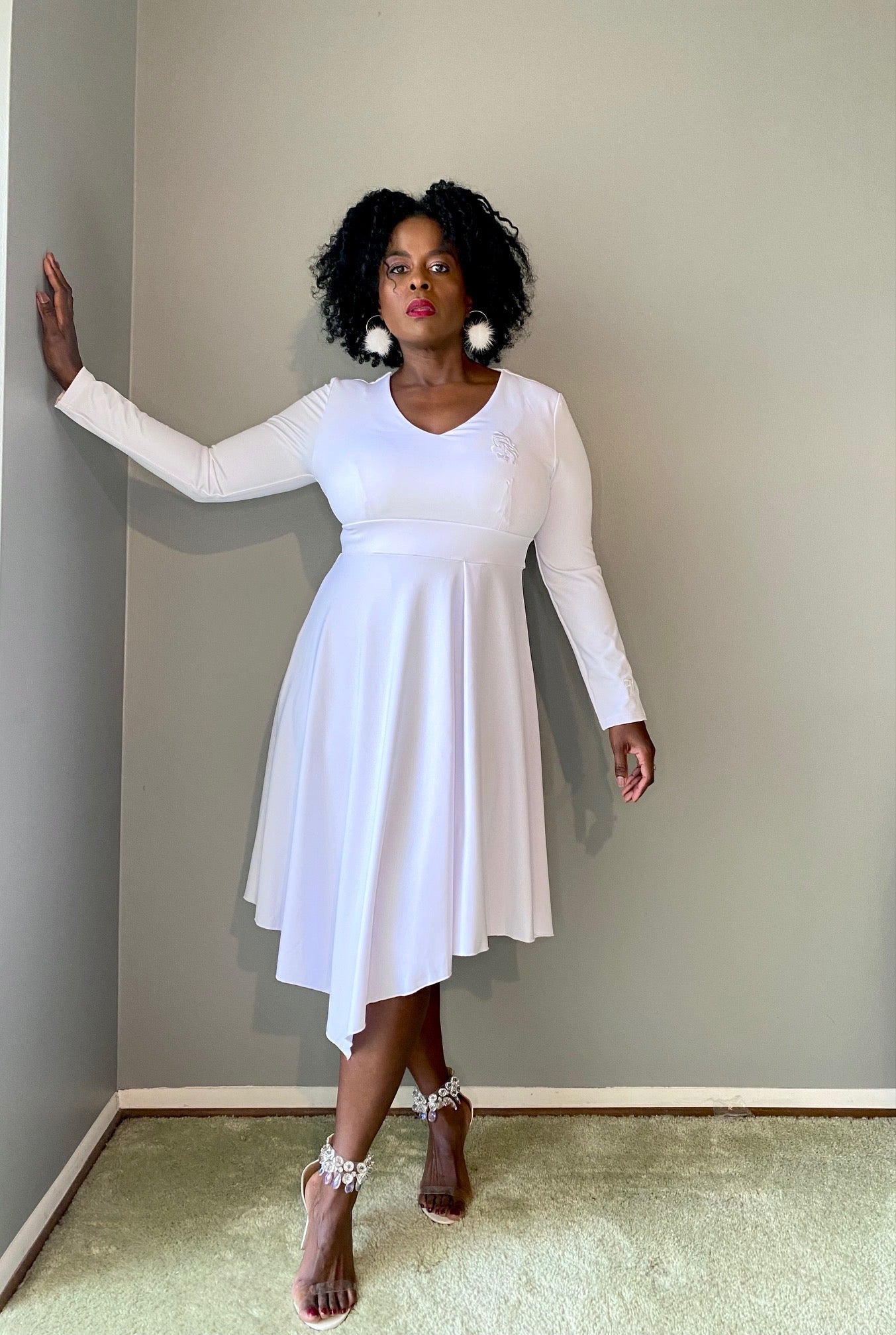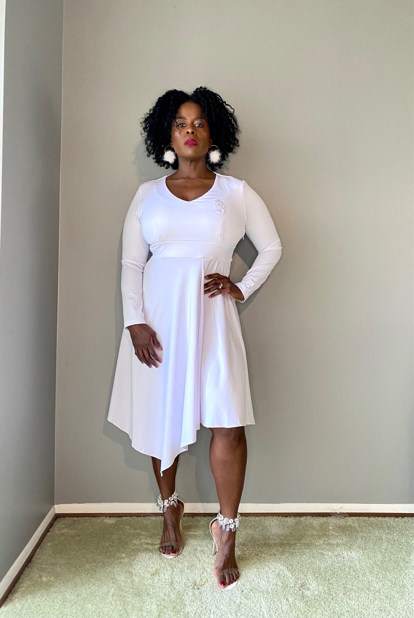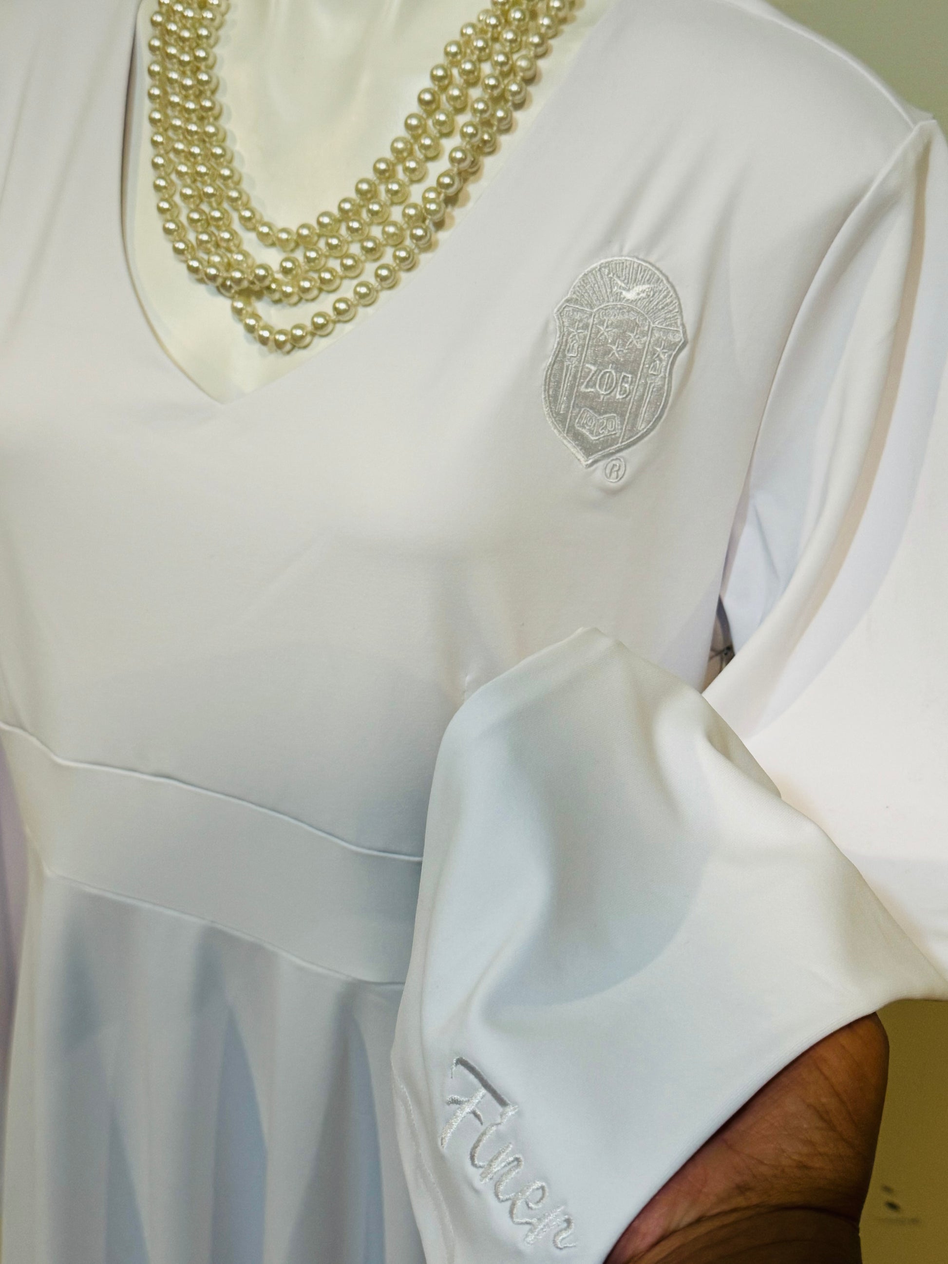 Refreshed & renewed, now with the shield on it! Our exclusive "Finer" SHIELD Handkerchief Hem White Dress gives you a high, low look and is perfect for any occasion business, casual. This item has white embroidery on true white material, it was designed to showcase Zeta and is even the perfect item for ceremonies and rituals. Can be worn alone or paired with our twin set cardigan or a contrasting blazer to head to a business meeting. Another staple for your wardrobe we are sure you will be pleased with! With a side zipper, each one is perfectly stitched to snatch you in the right places and is embroidered with white details; White shield embroidered on the front, "Finer' on the left sleeve and the principle “Finer Womanhood” embroidered across the neck at the back. This dress has a heavy weight lycra feel. It packs & travels very well.