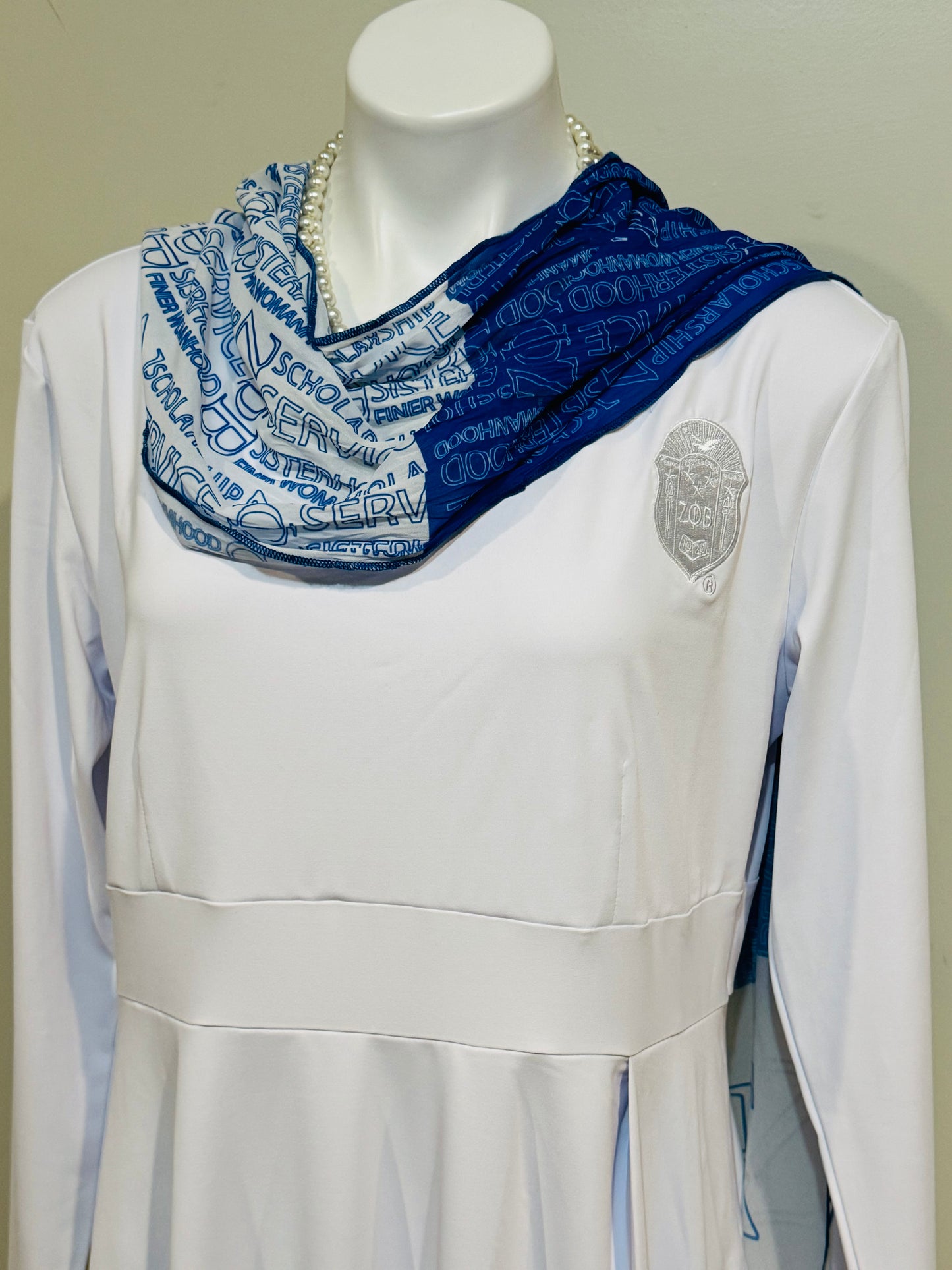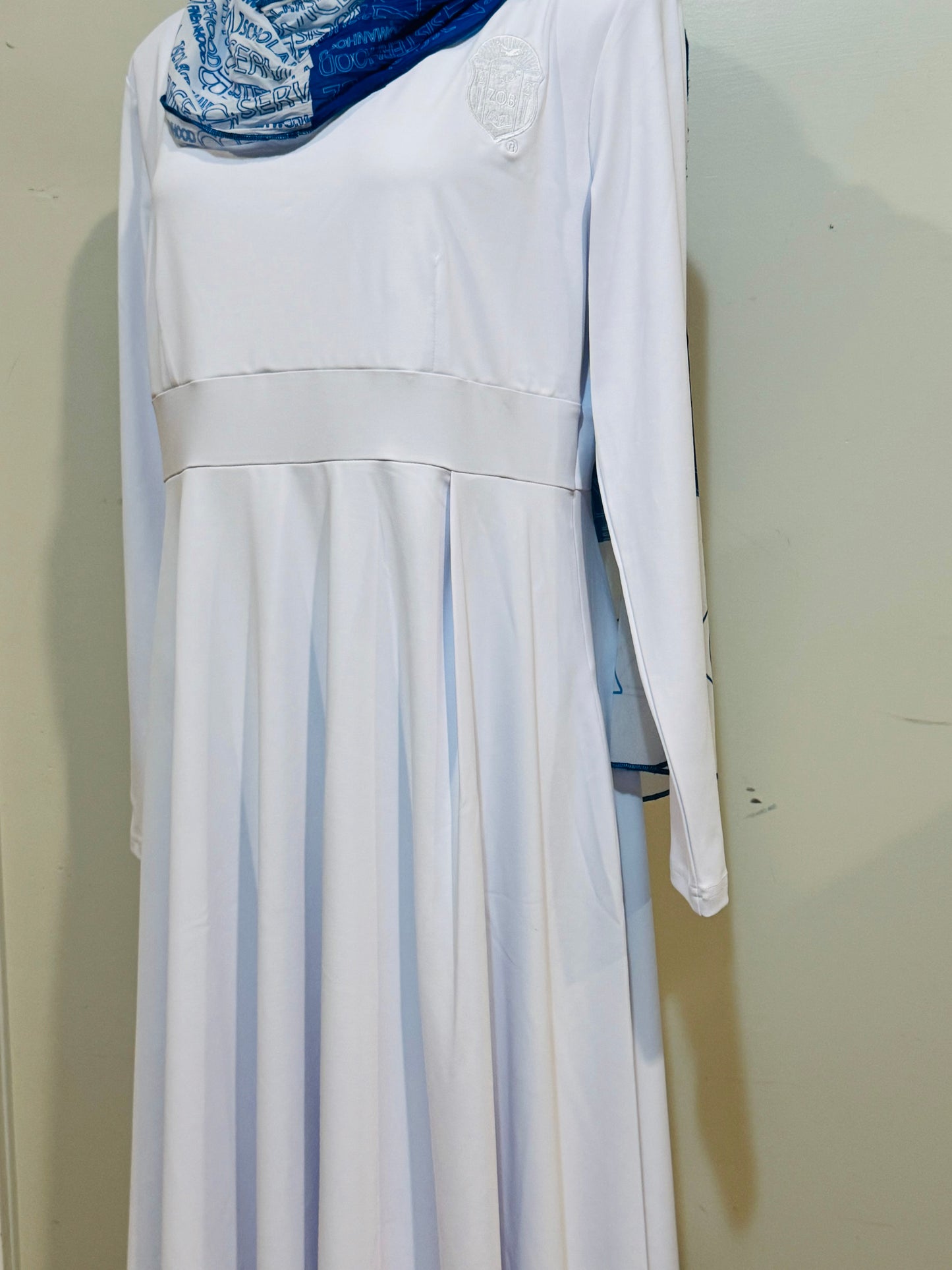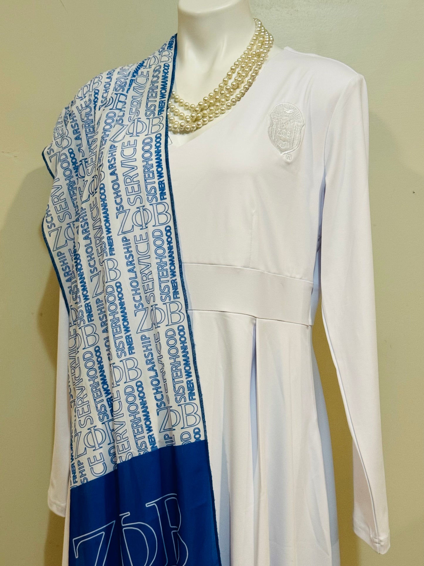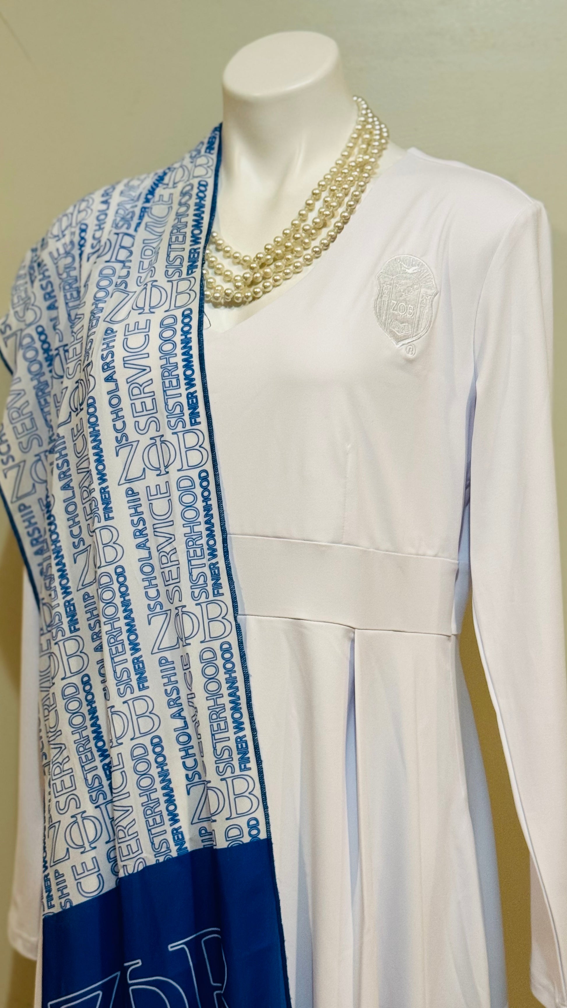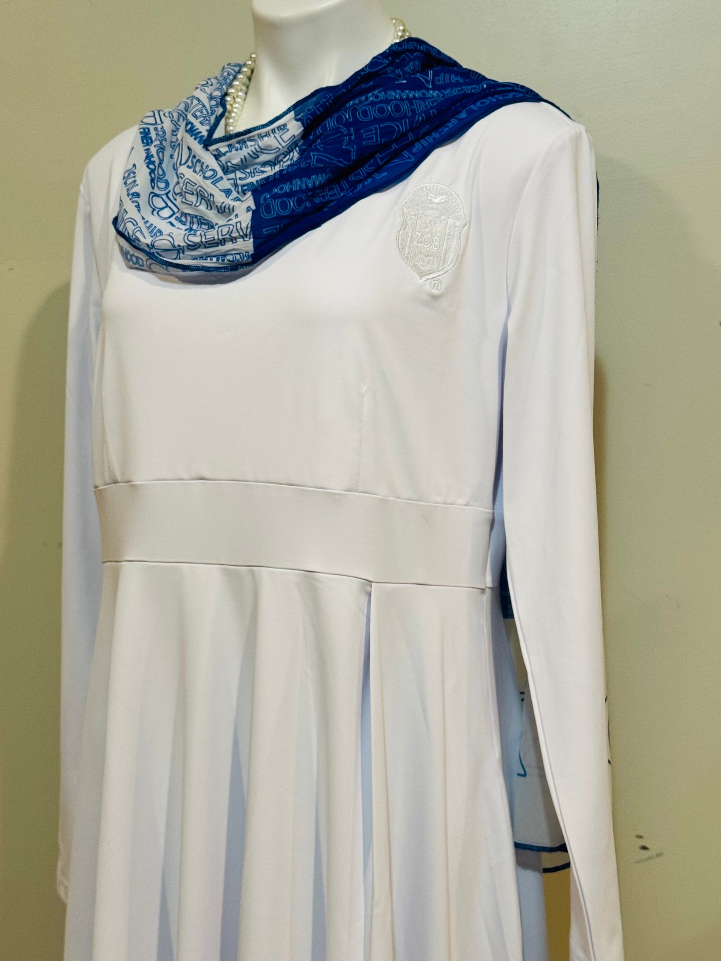 Refreshed & renewed, now with the shield on it! Our exclusive "Finer" SHIELD Handkerchief Hem White Dress gives you a high, low look and is perfect for any occasion business, casual. This item has white embroidery on true white material, it was designed to showcase Zeta and is even the perfect item for ceremonies and rituals. Can be worn alone or paired with our twin set cardigan or a contrasting blazer to head to a business meeting. Another staple for your wardrobe we are sure you will be pleased with! With a side zipper, each one is perfectly stitched to snatch you in the right places and is embroidered with white details; White shield embroidered on the front, "Finer' on the left sleeve and the principle “Finer Womanhood” embroidered across the neck at the back. This dress has a heavy weight lycra feel. It packs & travels very well.