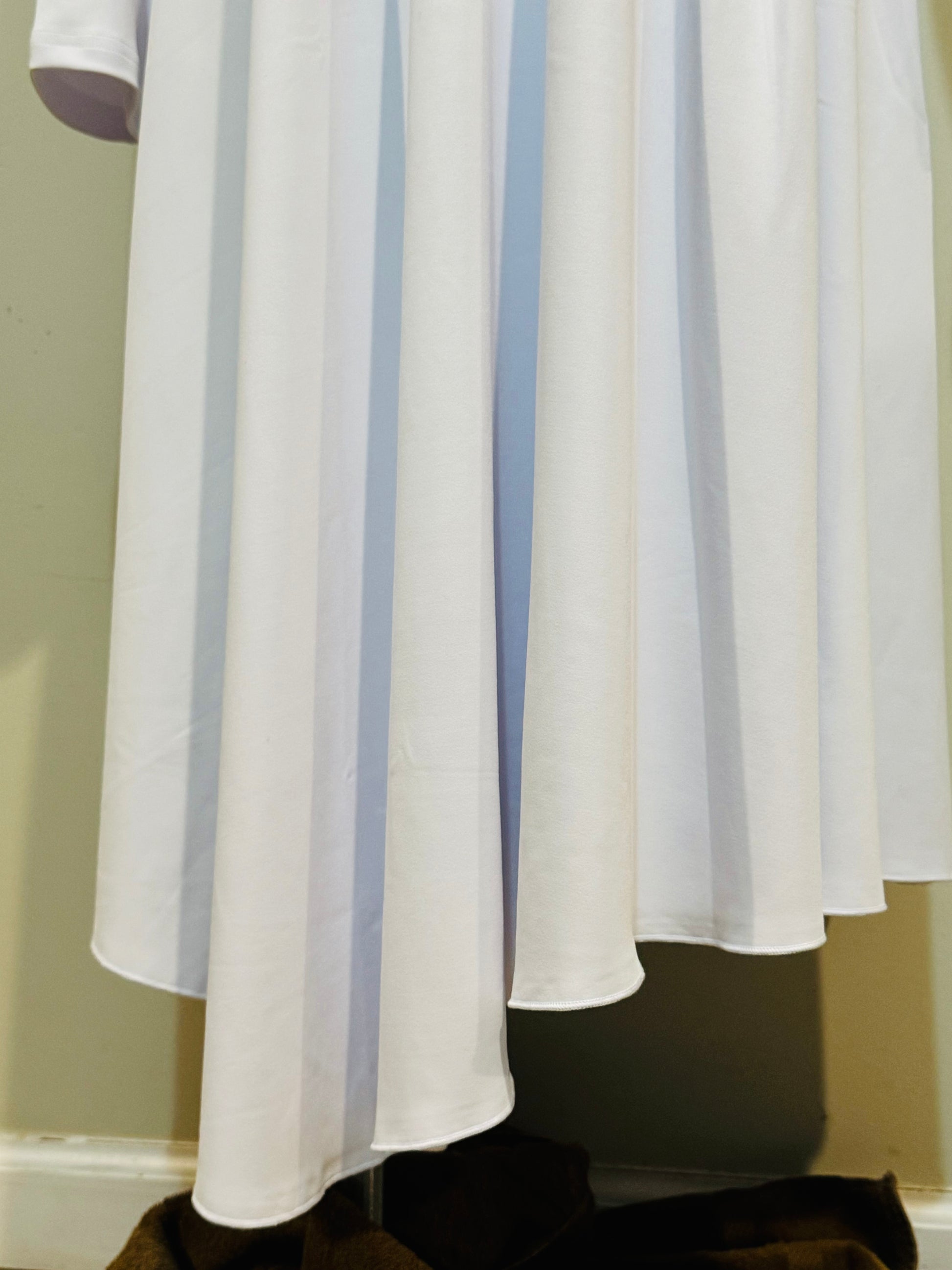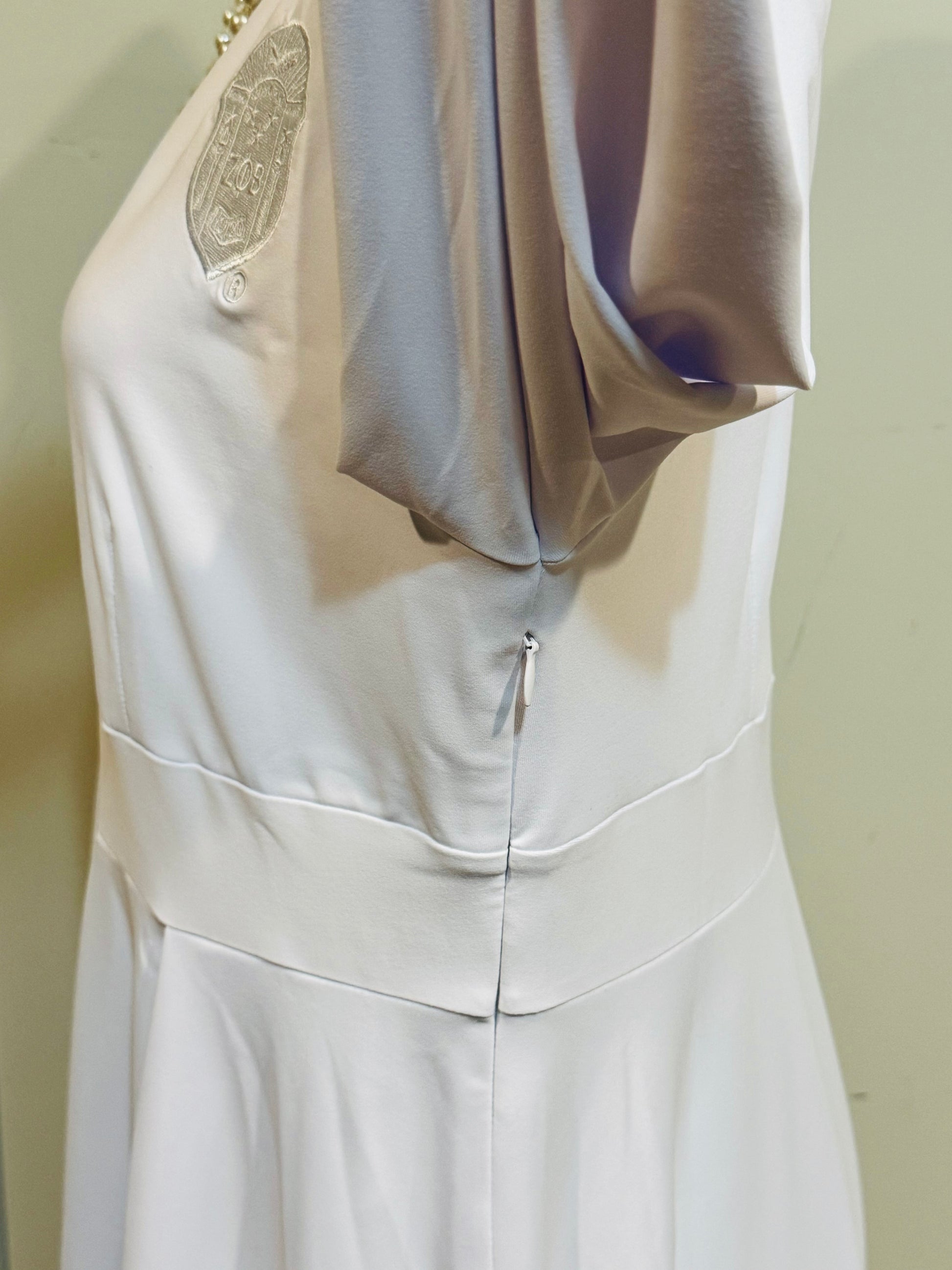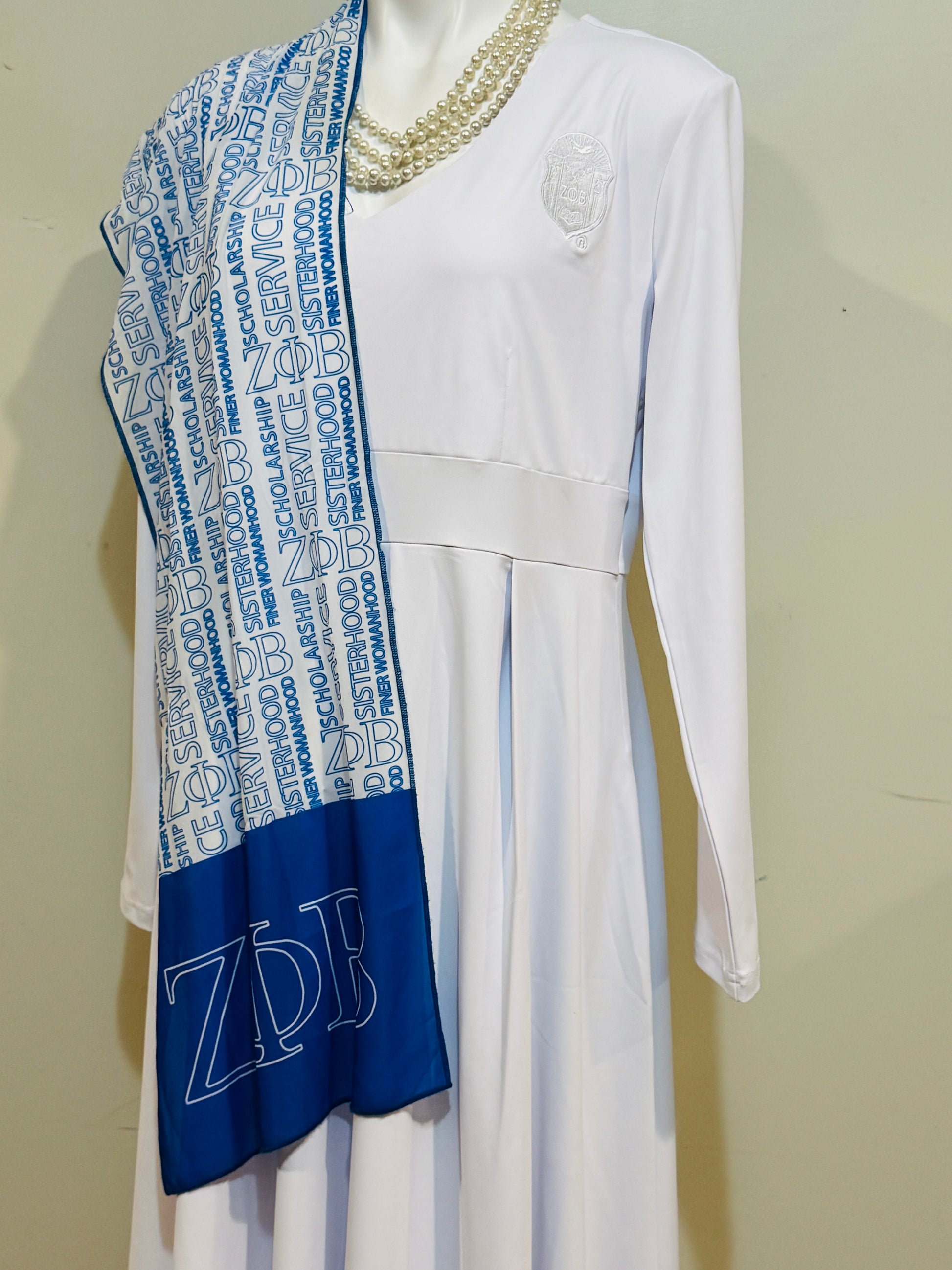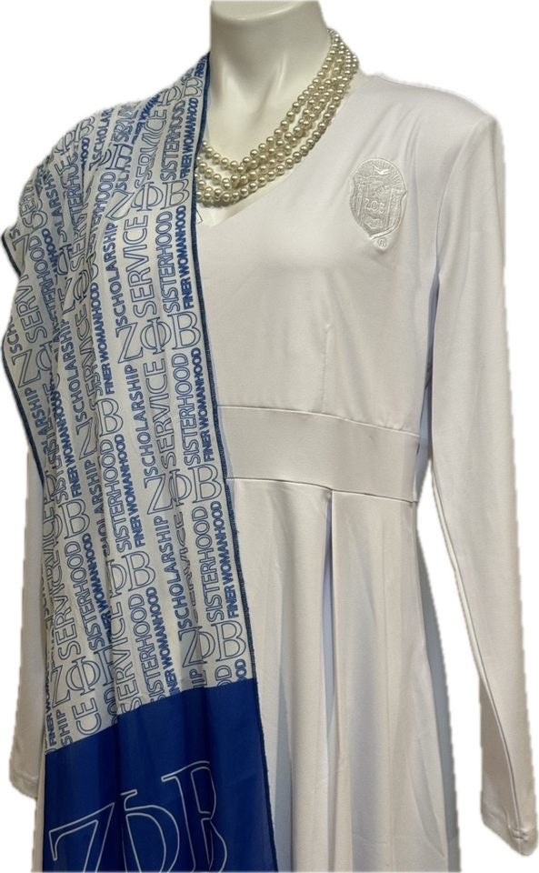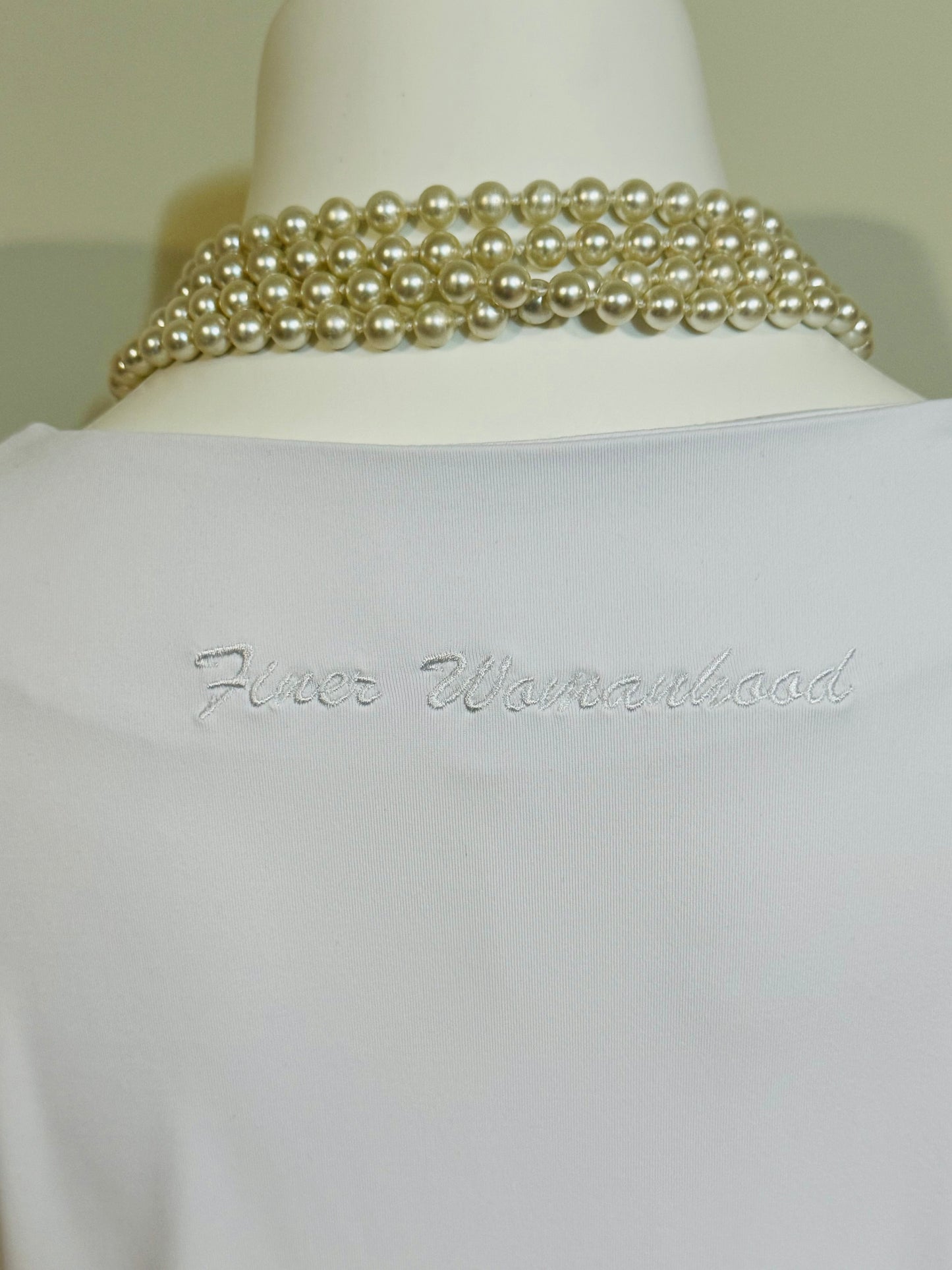 Refreshed & renewed, now with the shield on it! Our exclusive "Finer" SHIELD Handkerchief Hem White Dress gives you a high, low look and is perfect for any occasion business, casual. This item has white embroidery on true white material, it was designed to showcase Zeta and is even the perfect item for ceremonies and rituals. Can be worn alone or paired with our twin set cardigan or a contrasting blazer to head to a business meeting. Another staple for your wardrobe we are sure you will be pleased with! With a side zipper, each one is perfectly stitched to snatch you in the right places and is embroidered with white details; White shield embroidered on the front, "Finer' on the left sleeve and the principle “Finer Womanhood” embroidered across the neck at the back. This dress has a heavy weight lycra feel. It packs & travels very well.