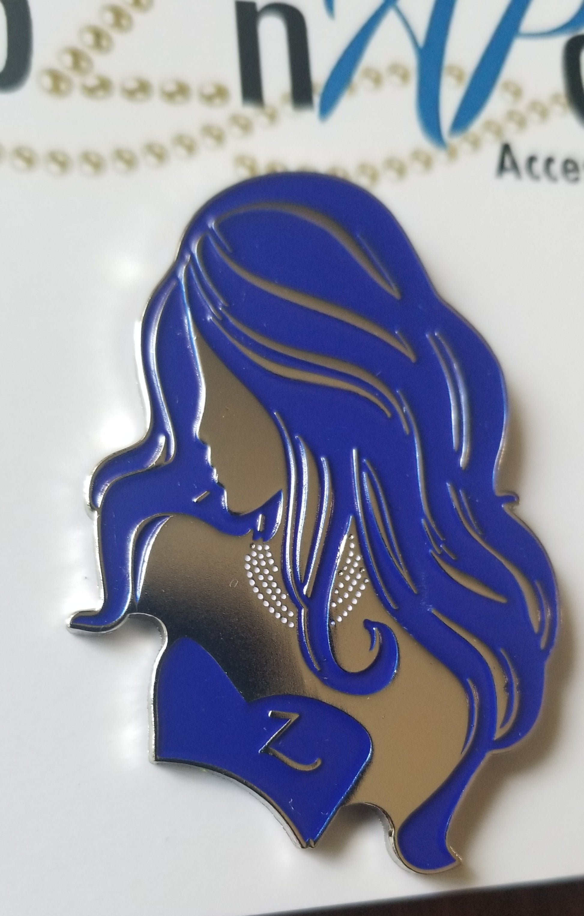 A gorgeous feminine lapel pin to add to your collection. This is a 2 inch lapel pin with 2 stoppers to secure onto your clothing.