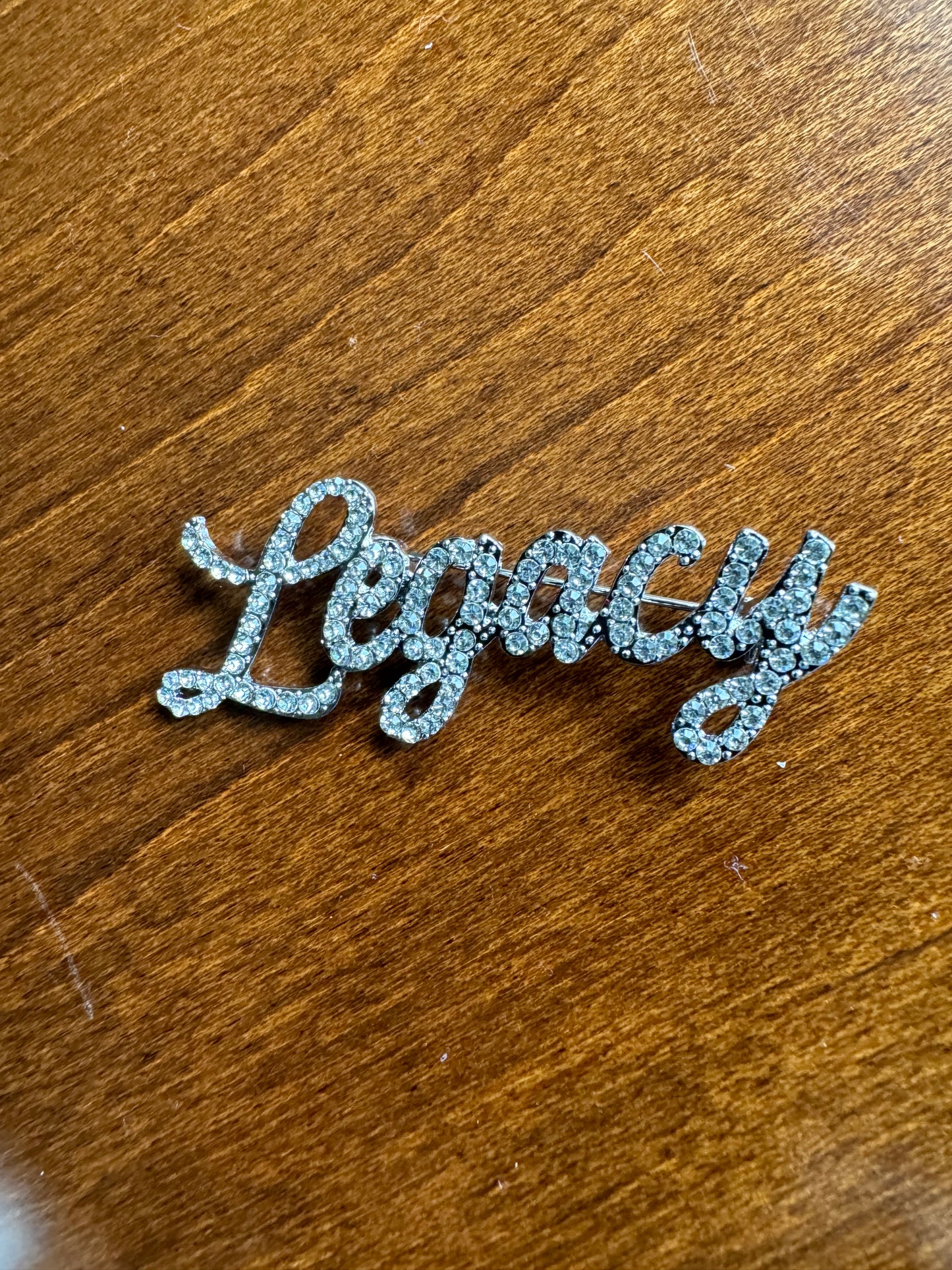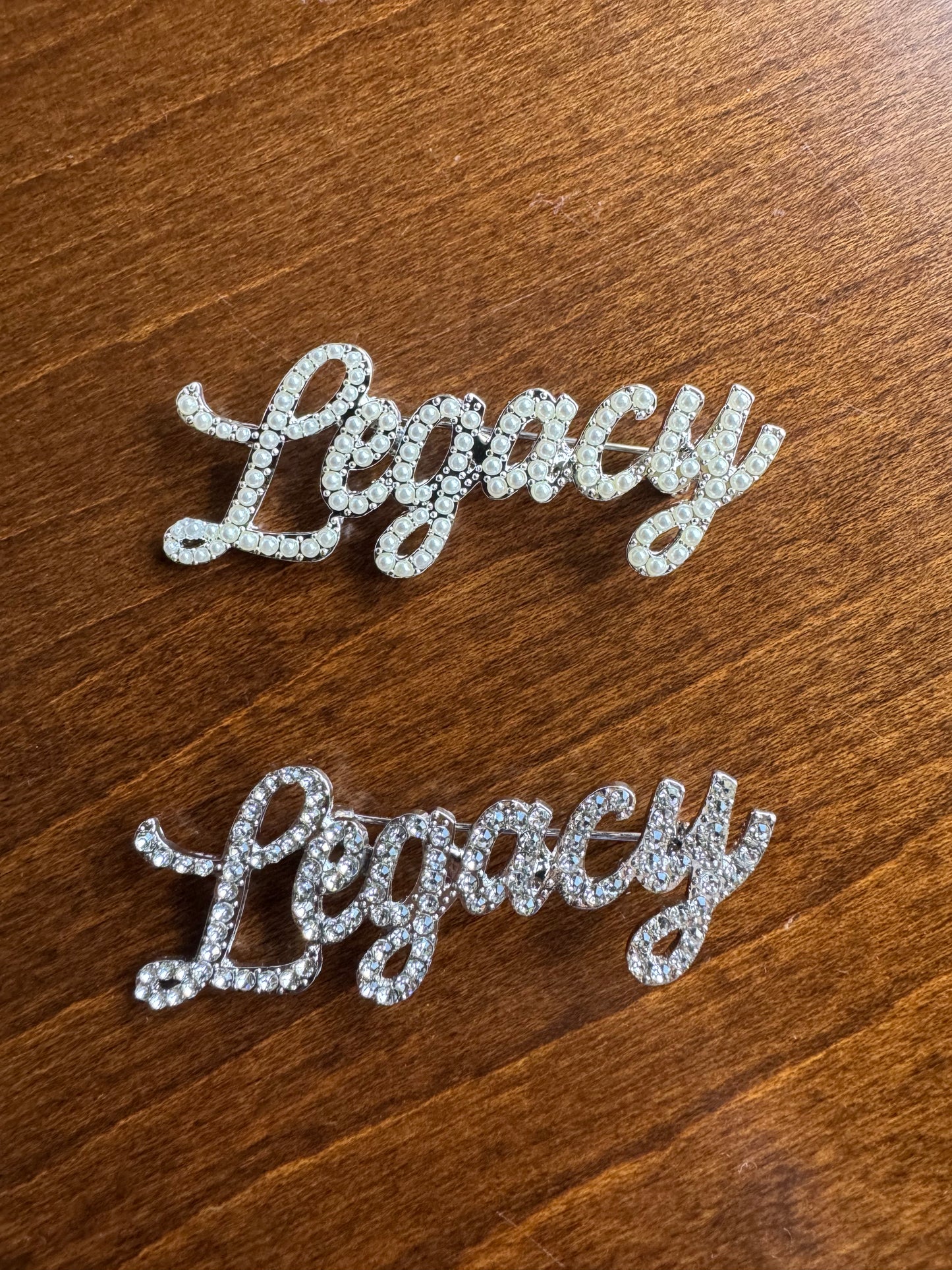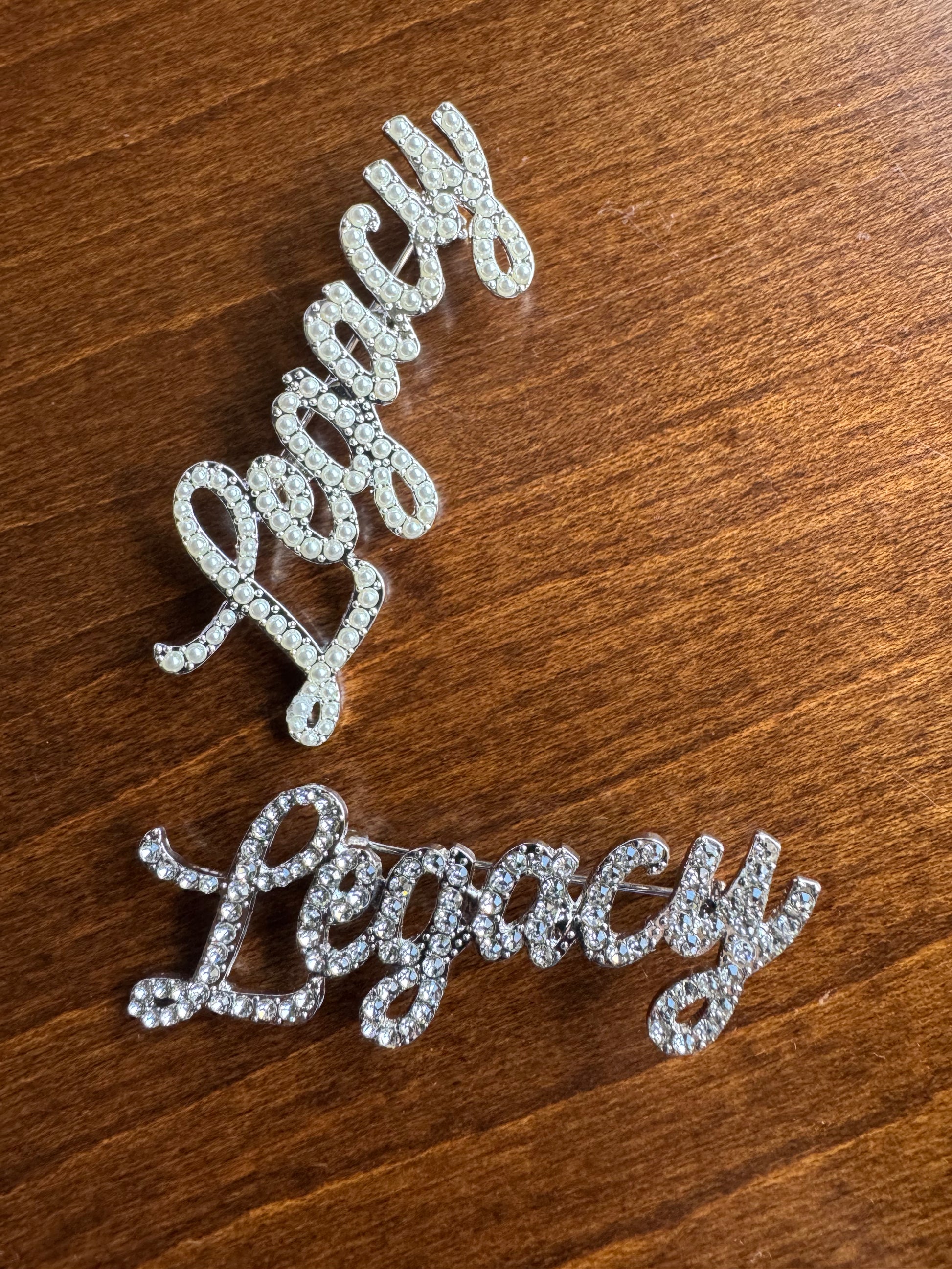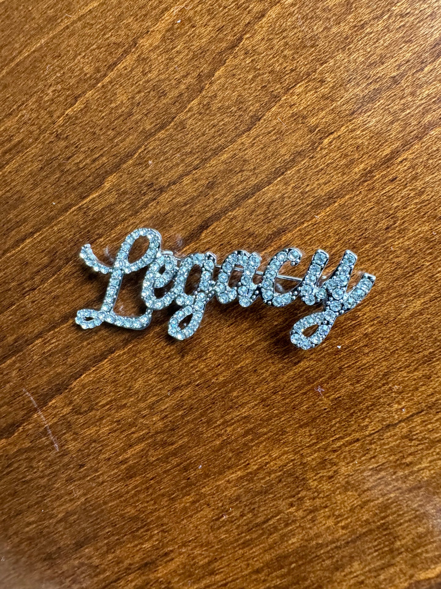 For the Legacy in you! This is a gorgeous feminine lapel pin to add to your collection. This is a 2 inch lapel pin is adorned in clear stones.