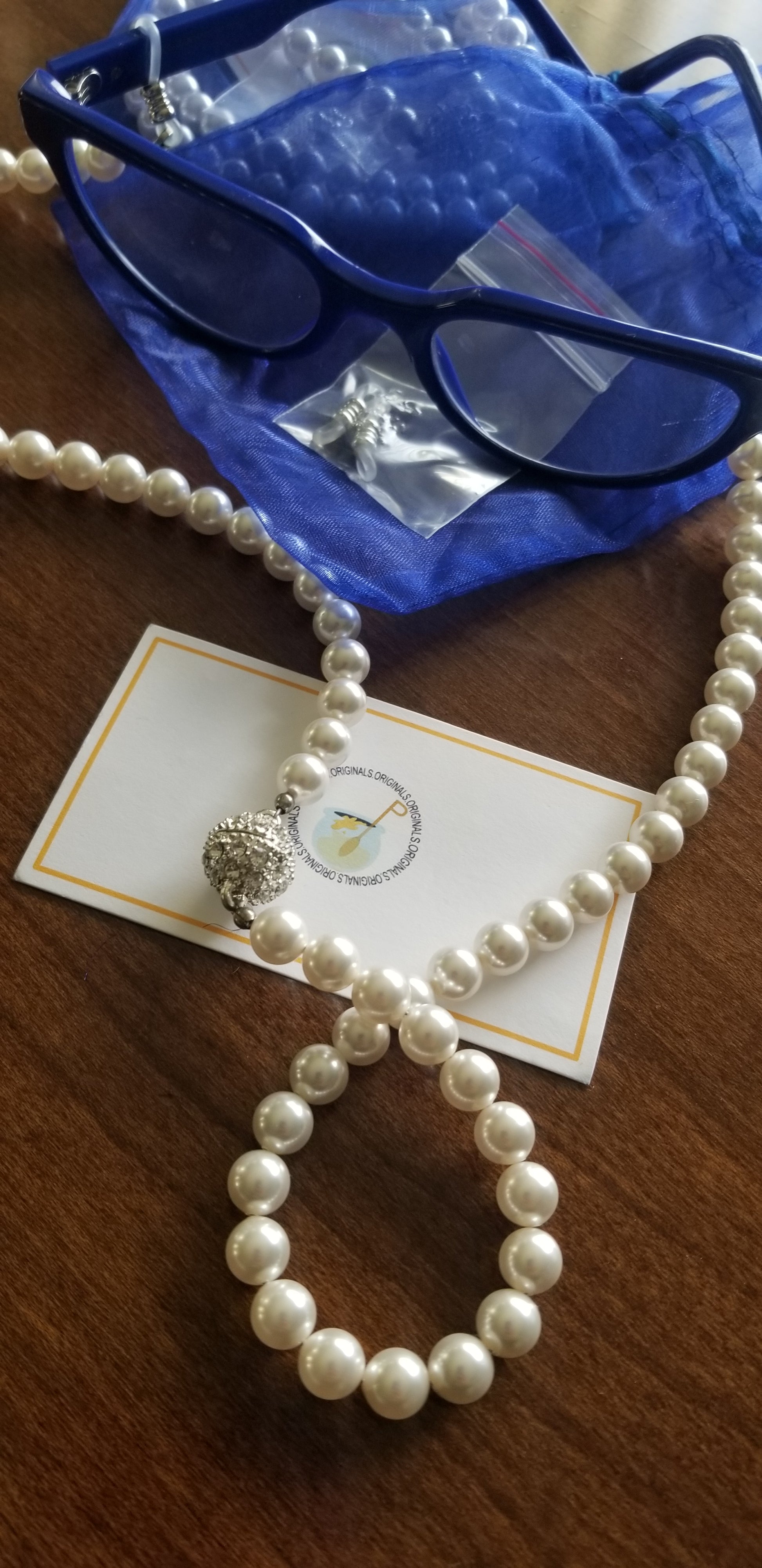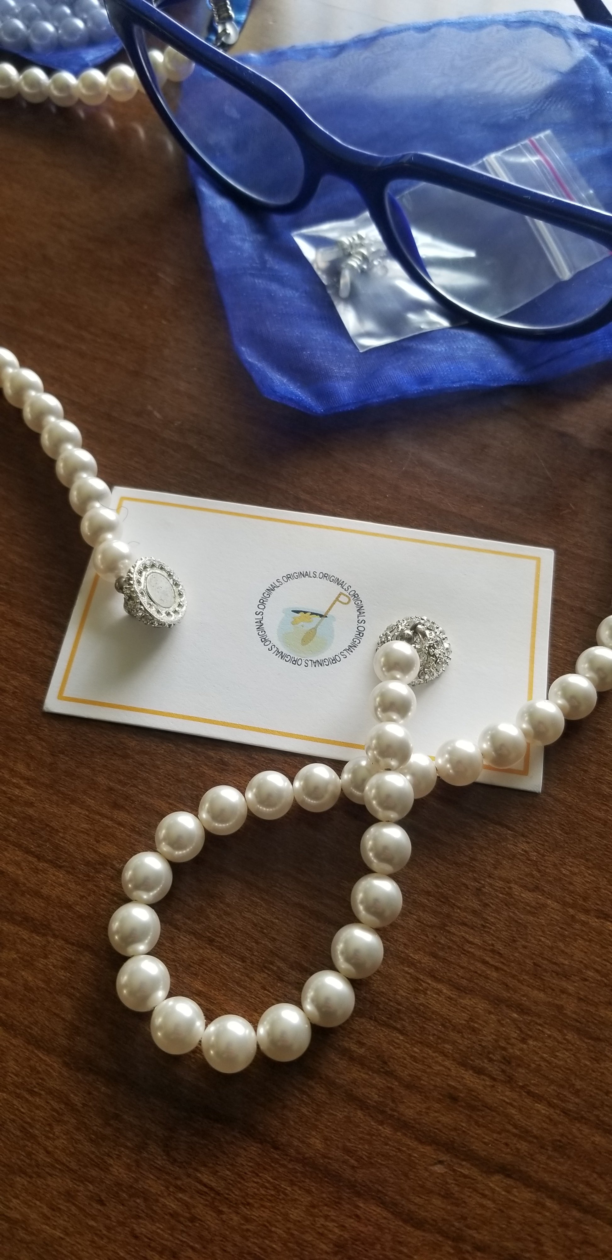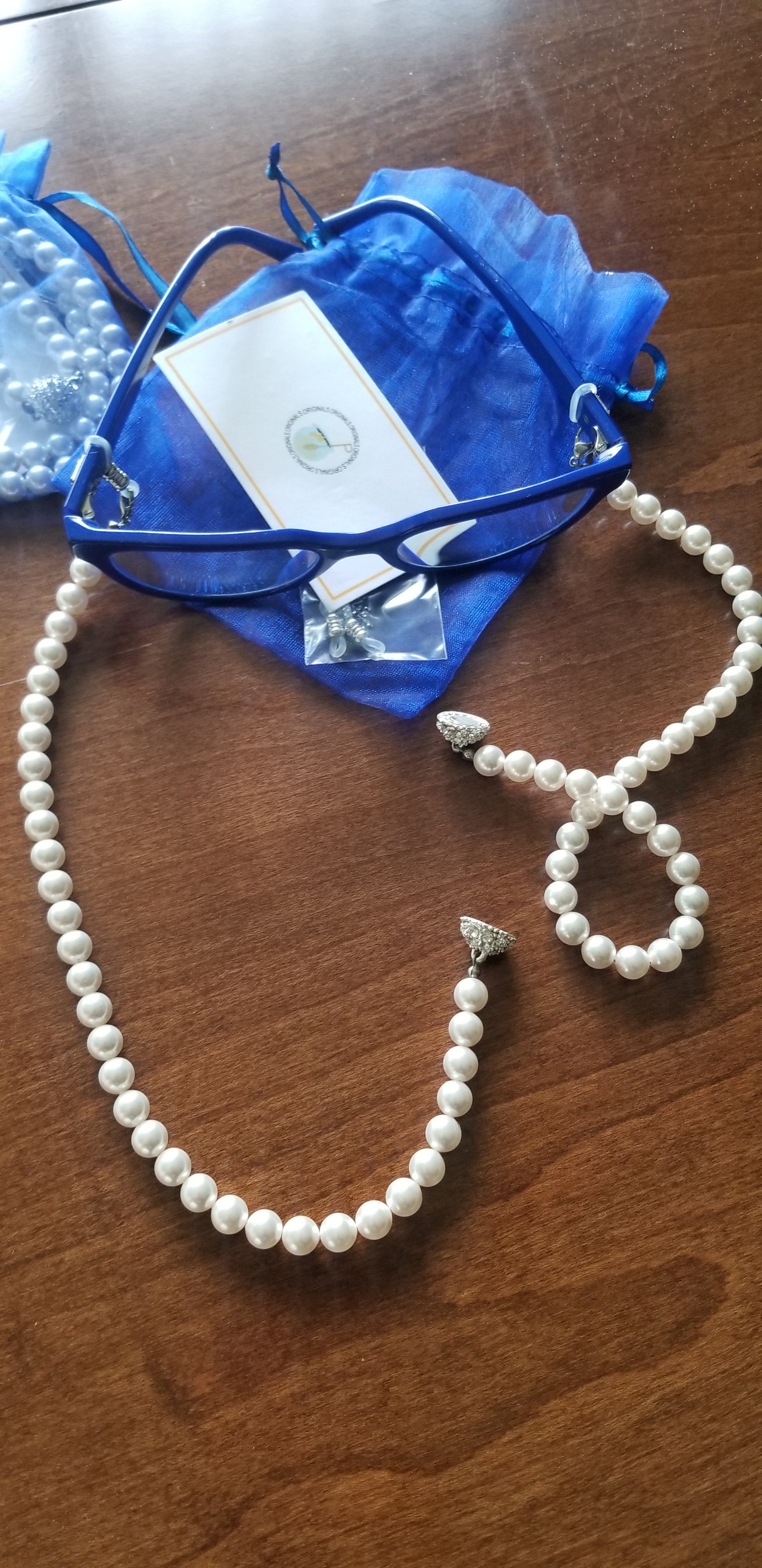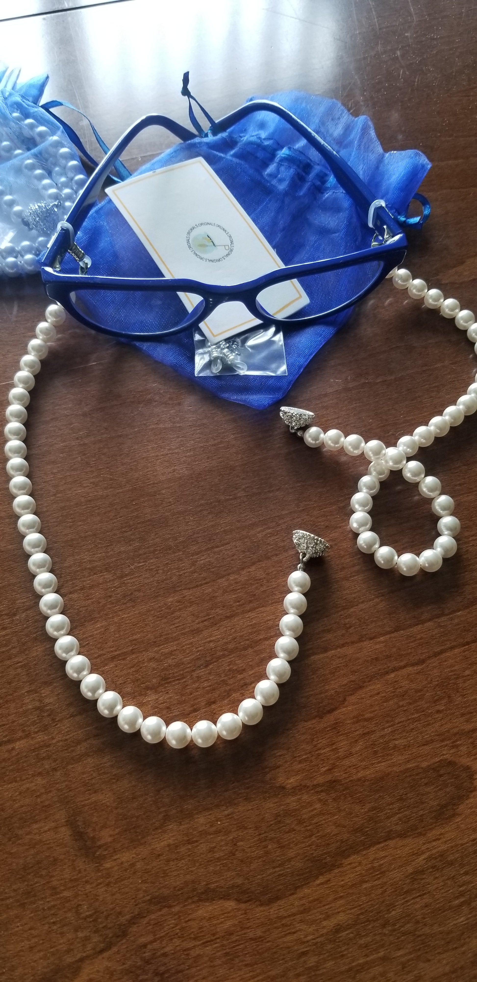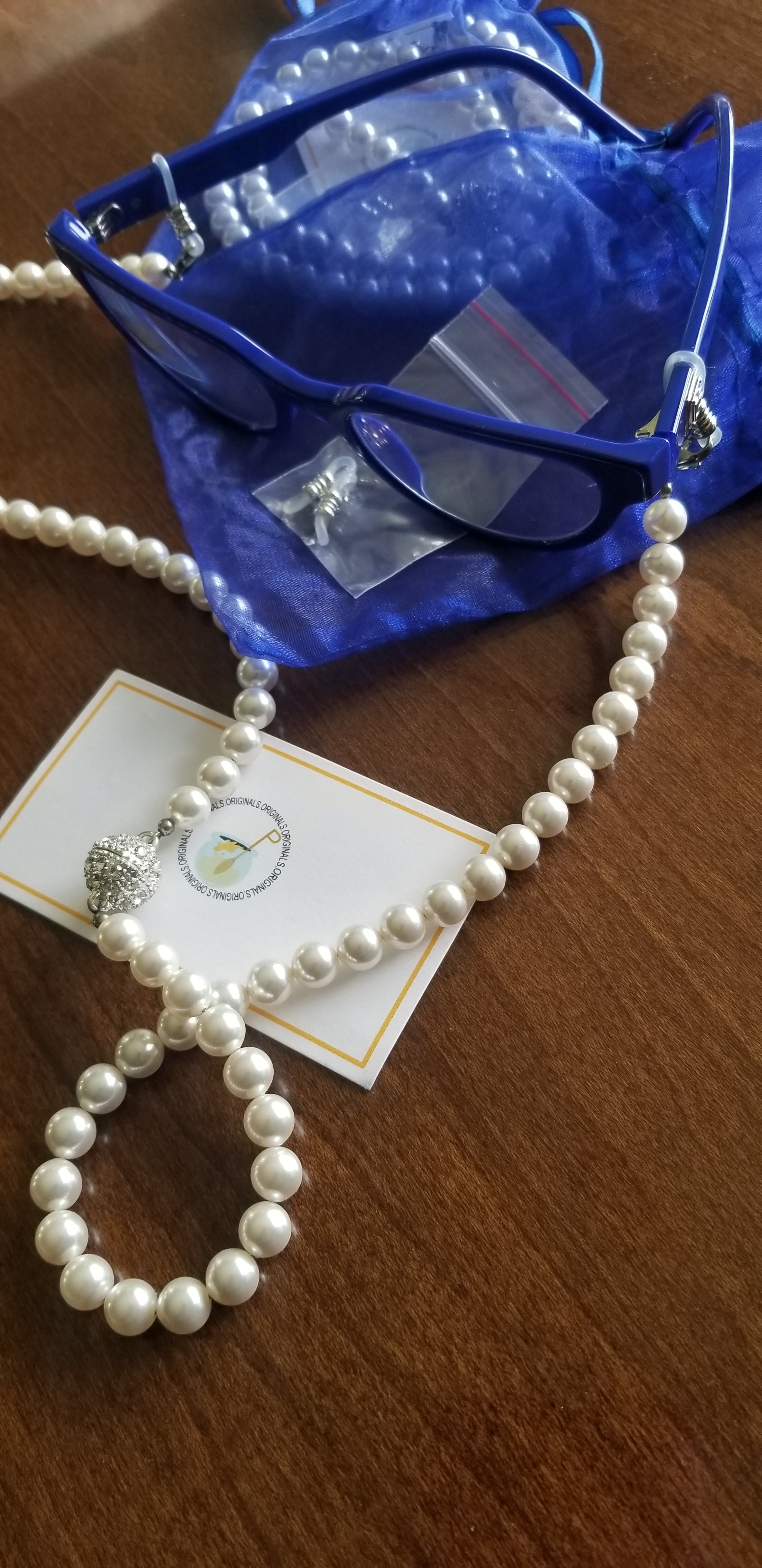 (PRE-ORDER) A beautiful custom made design by Honee P Originals, meticulously hand designed! These speclaces are a heavy weight and elegantly hold any pair of eyeglasses or even sunglasses. Strands of pearls have a magnetic clasp for easy break away. When you forget your necklace, you can turn these eyeglass holders into a pearl necklacks and accessorize any outfit. (Glasses not included)