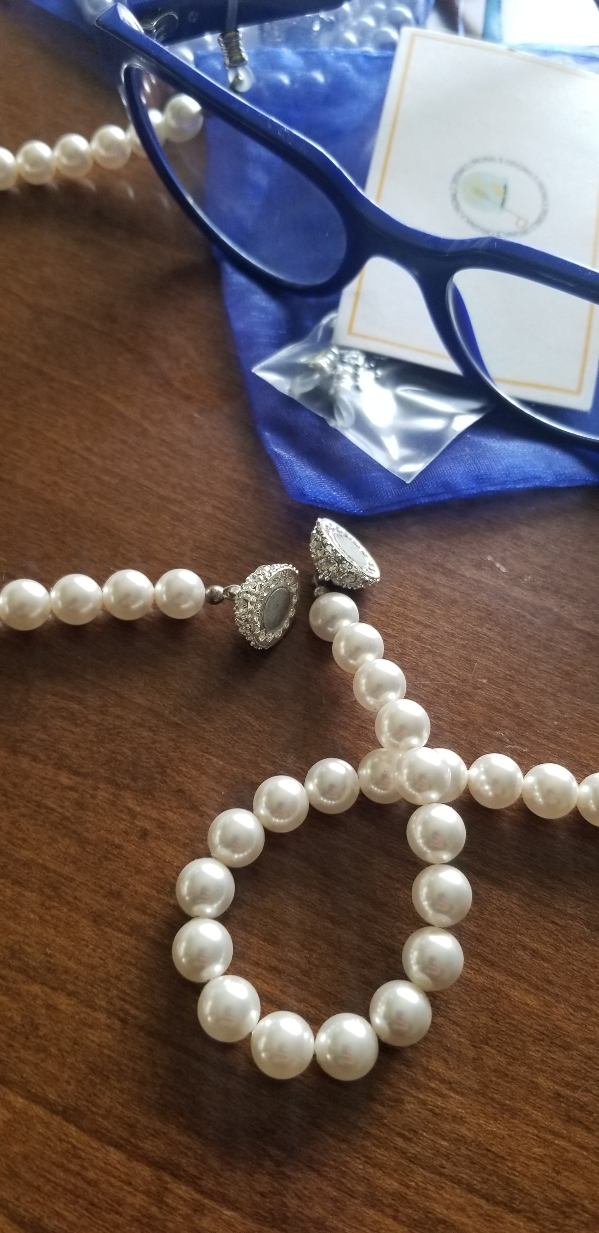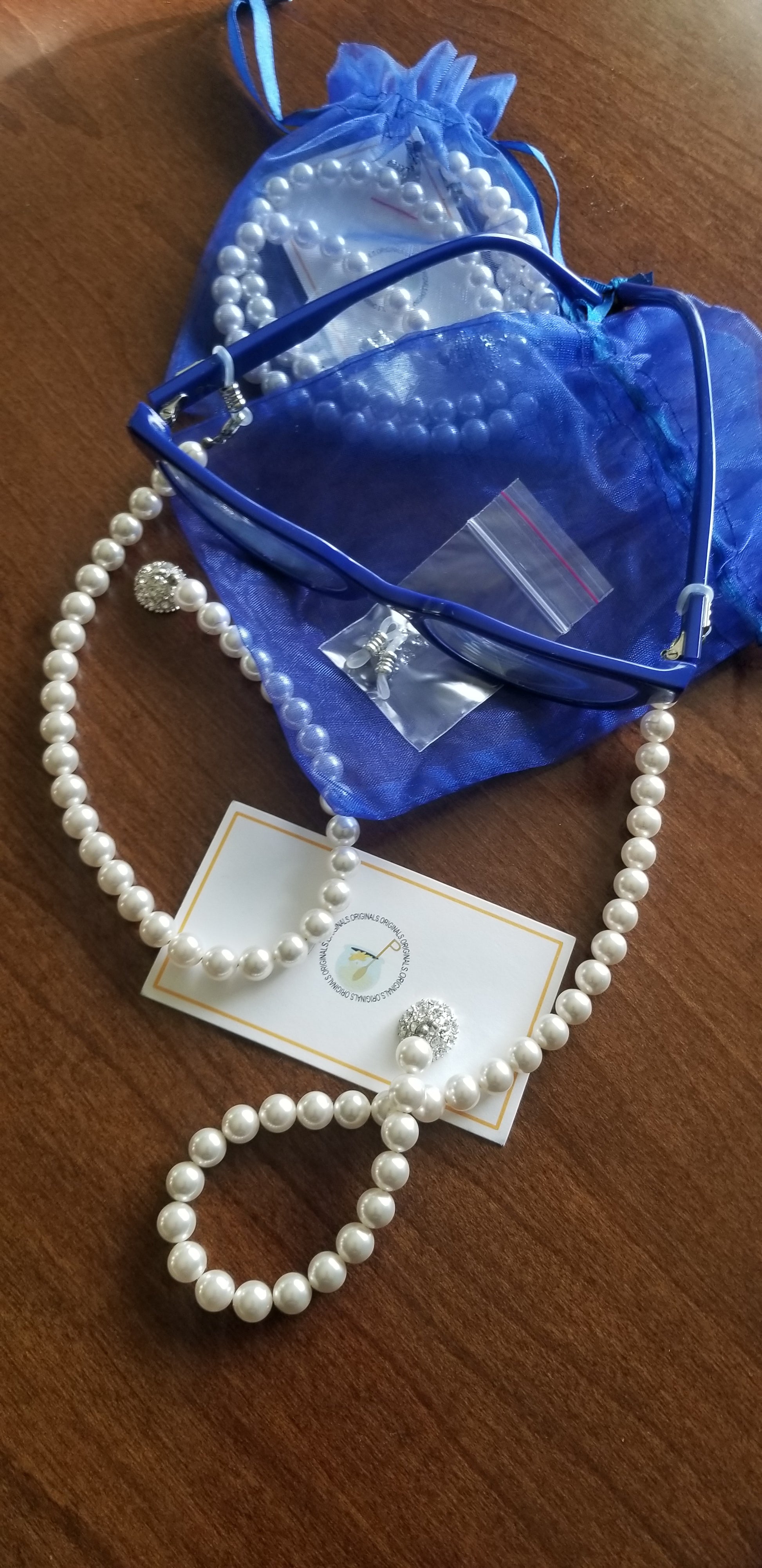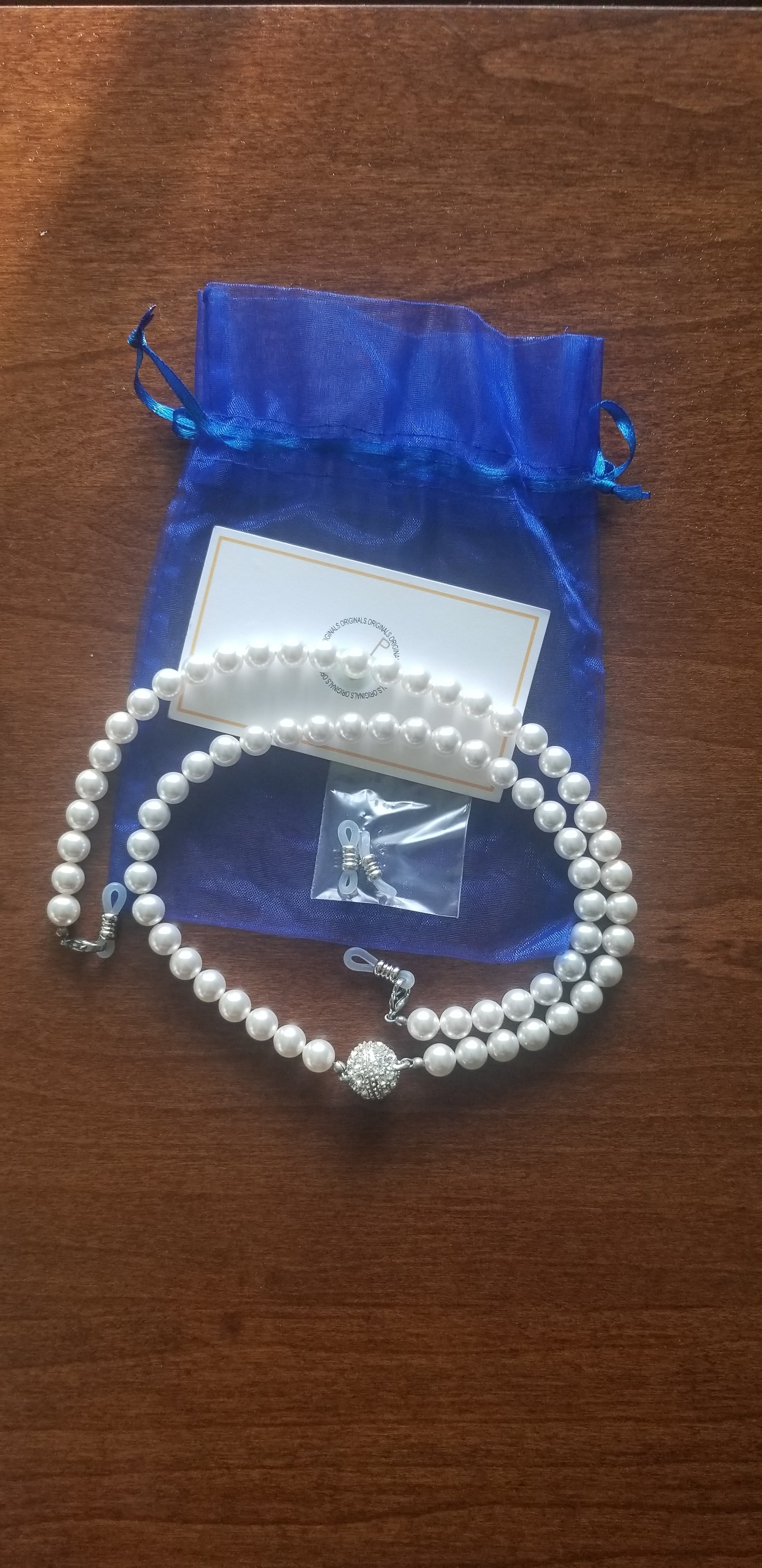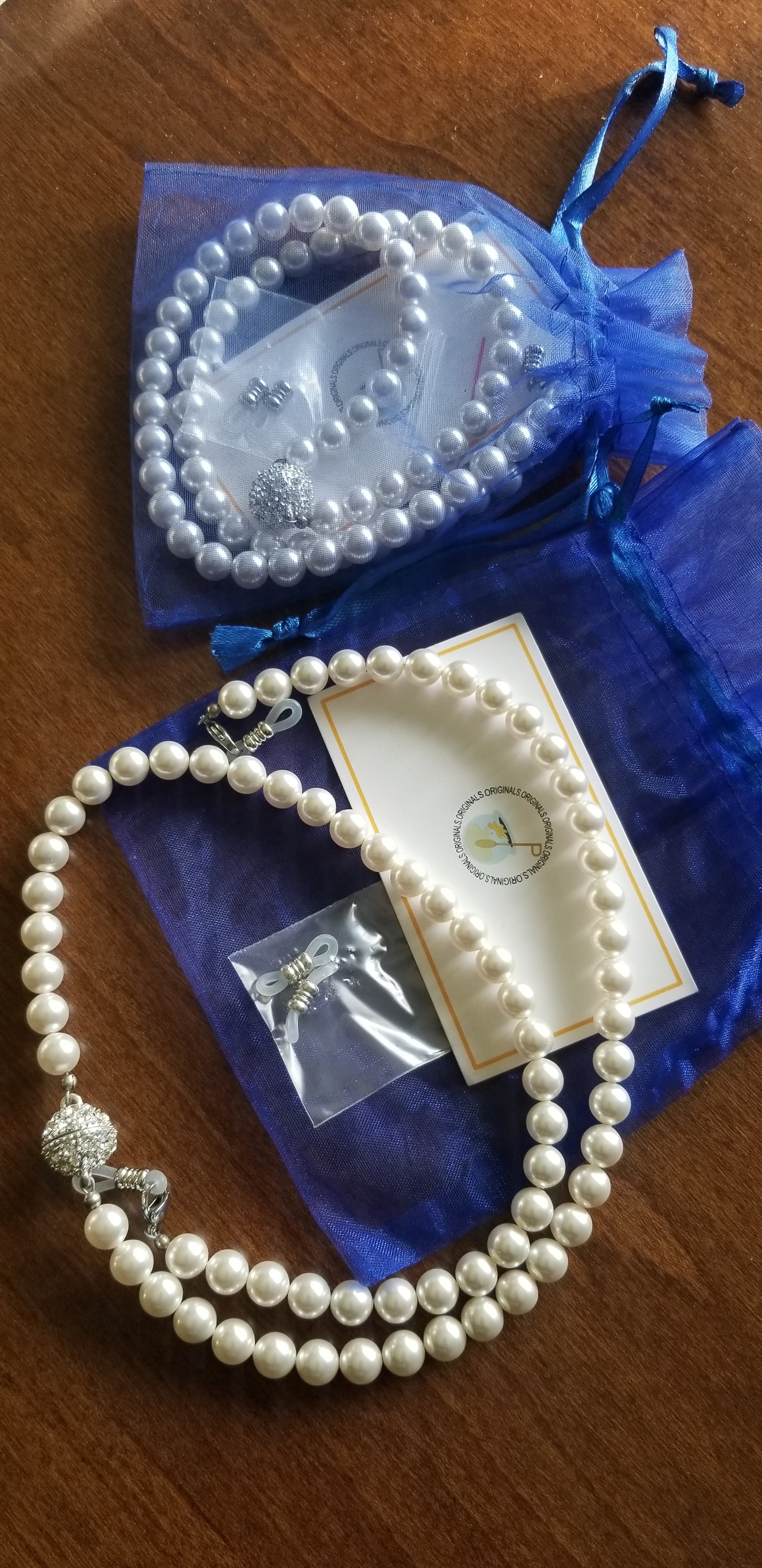 (PRE-ORDER) A beautiful custom made design by Honee P Originals, meticulously hand designed! These speclaces are a heavy weight and elegantly hold any pair of eyeglasses or even sunglasses. Strands of pearls have a magnetic clasp for easy break away. When you forget your necklace, you can turn these eyeglass holders into a pearl necklacks and accessorize any outfit. (Glasses not included)