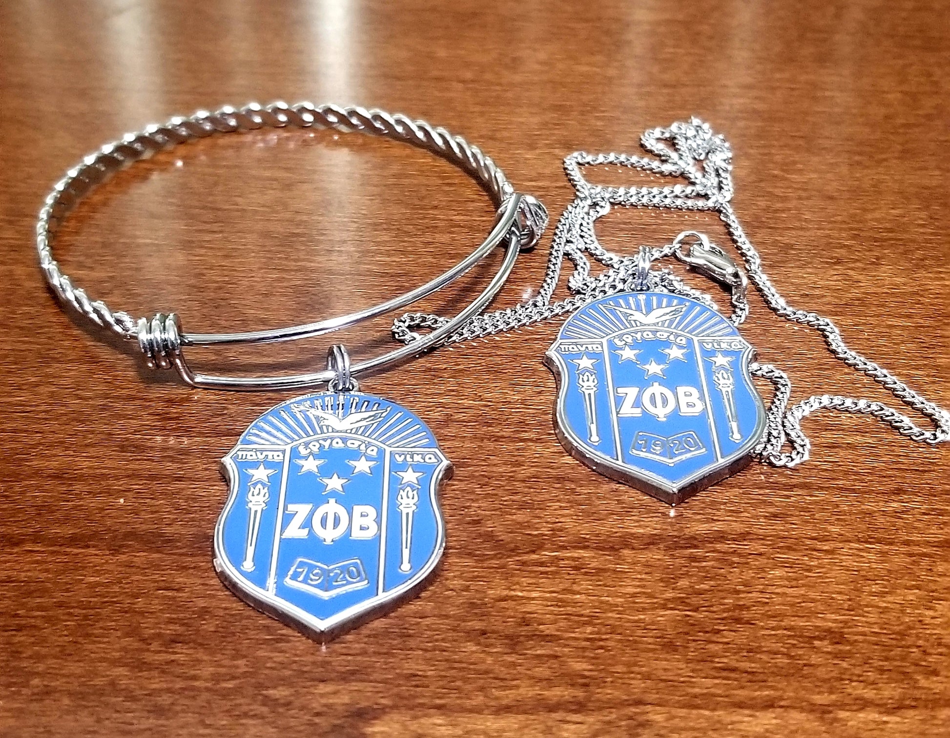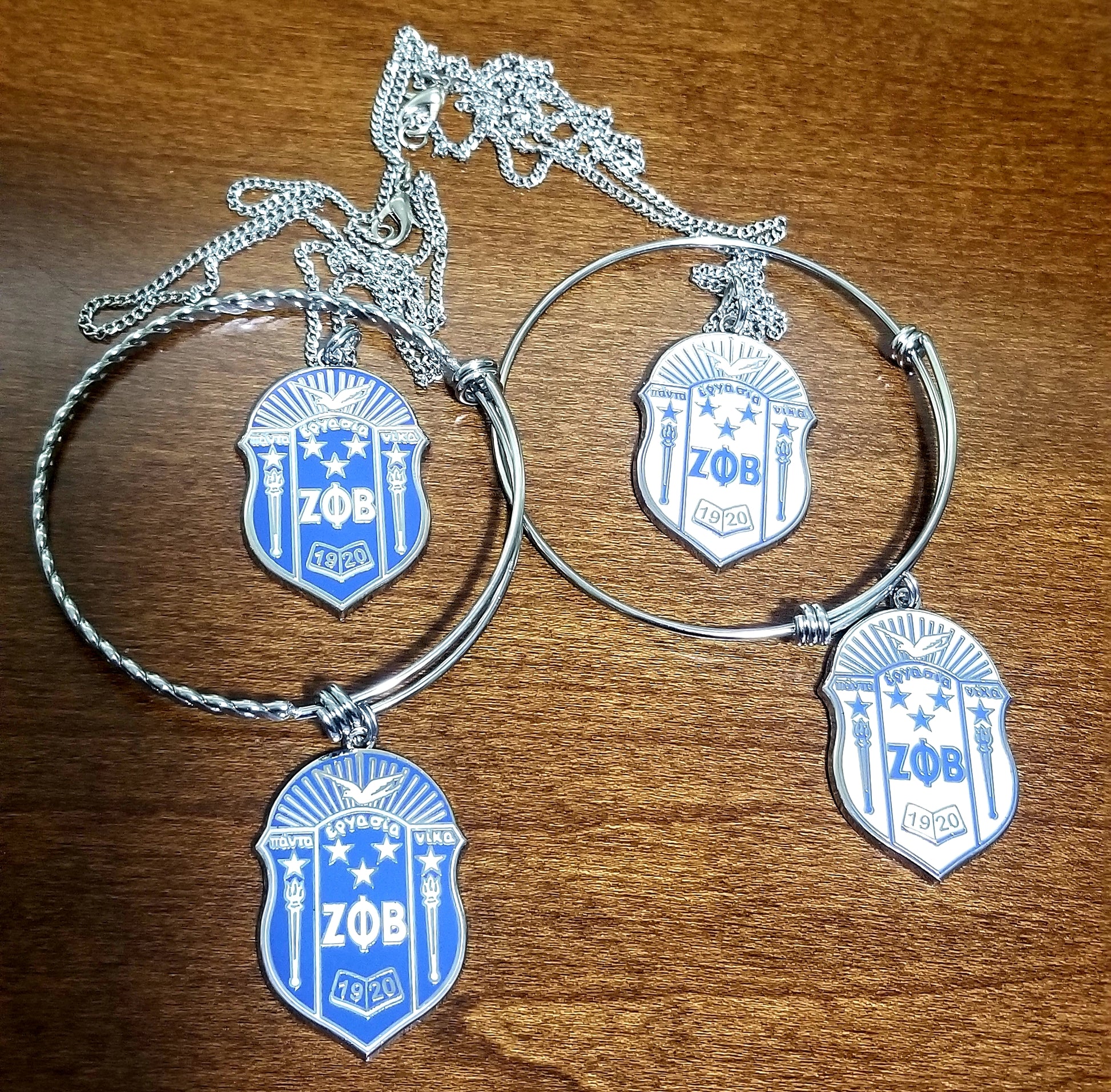 Proudly represent with our Official Shield products! 2 inch necklace charm is on a stainless steel necklace. Extra large bracelet charm rests on a stainless steel adjustable bracelet.