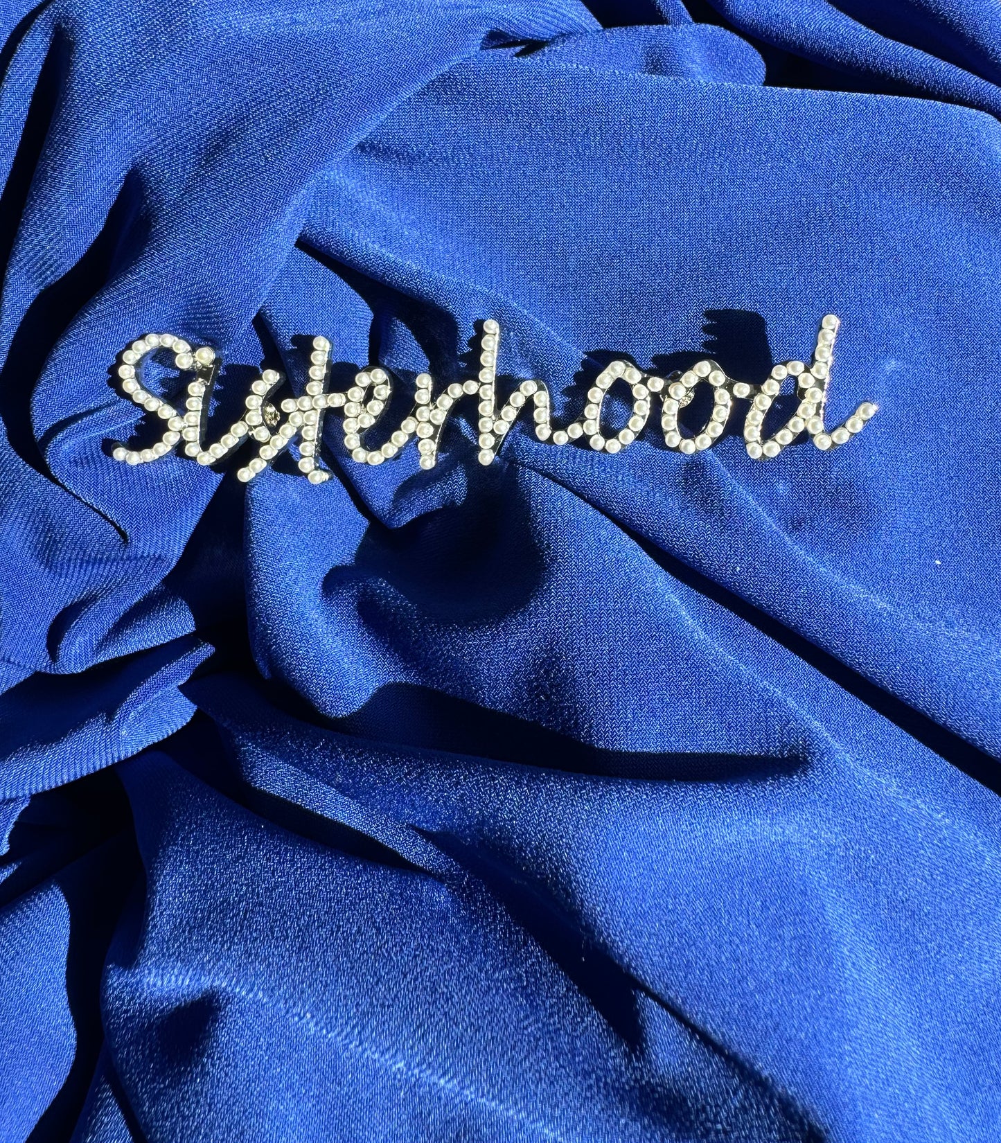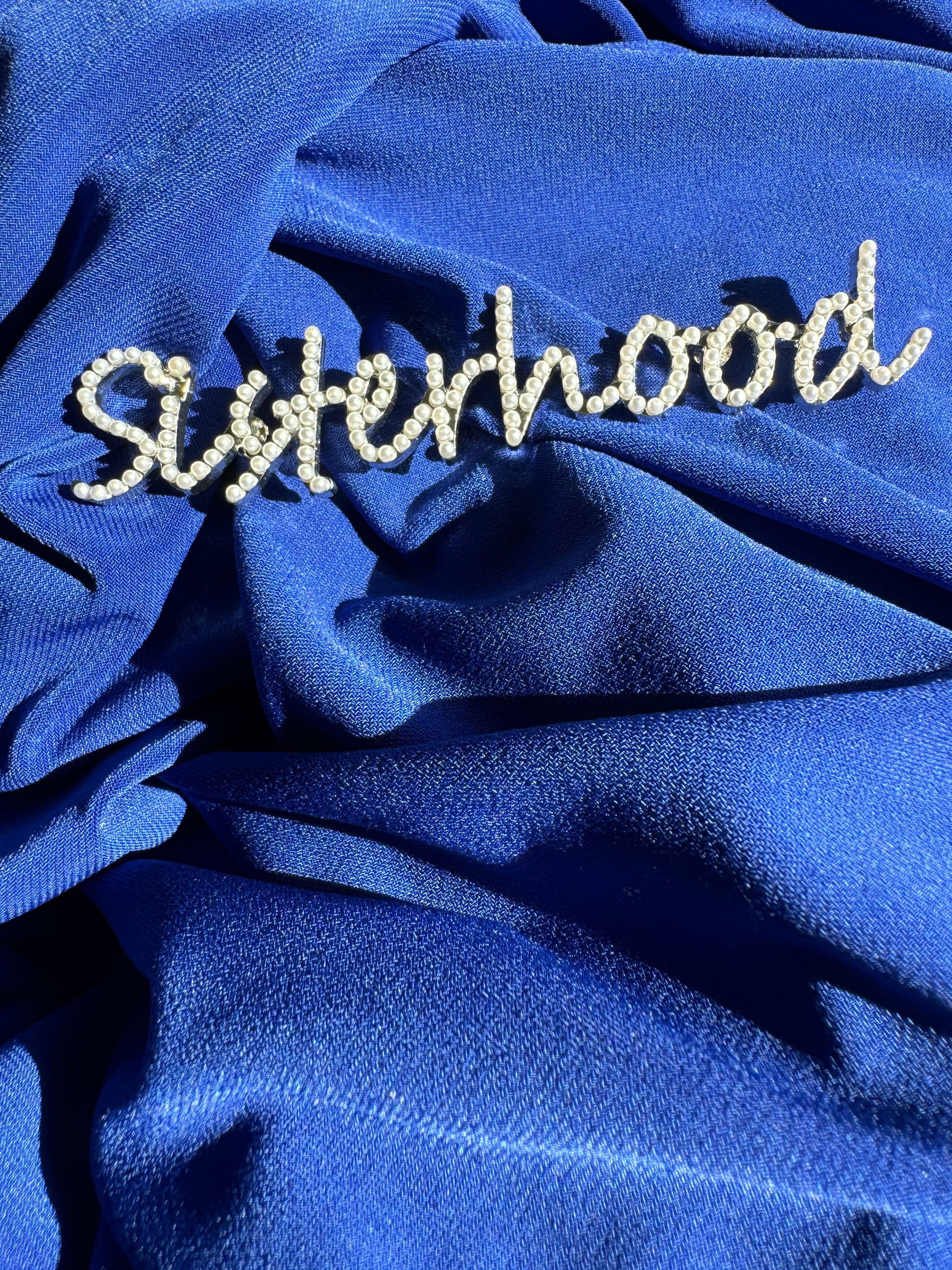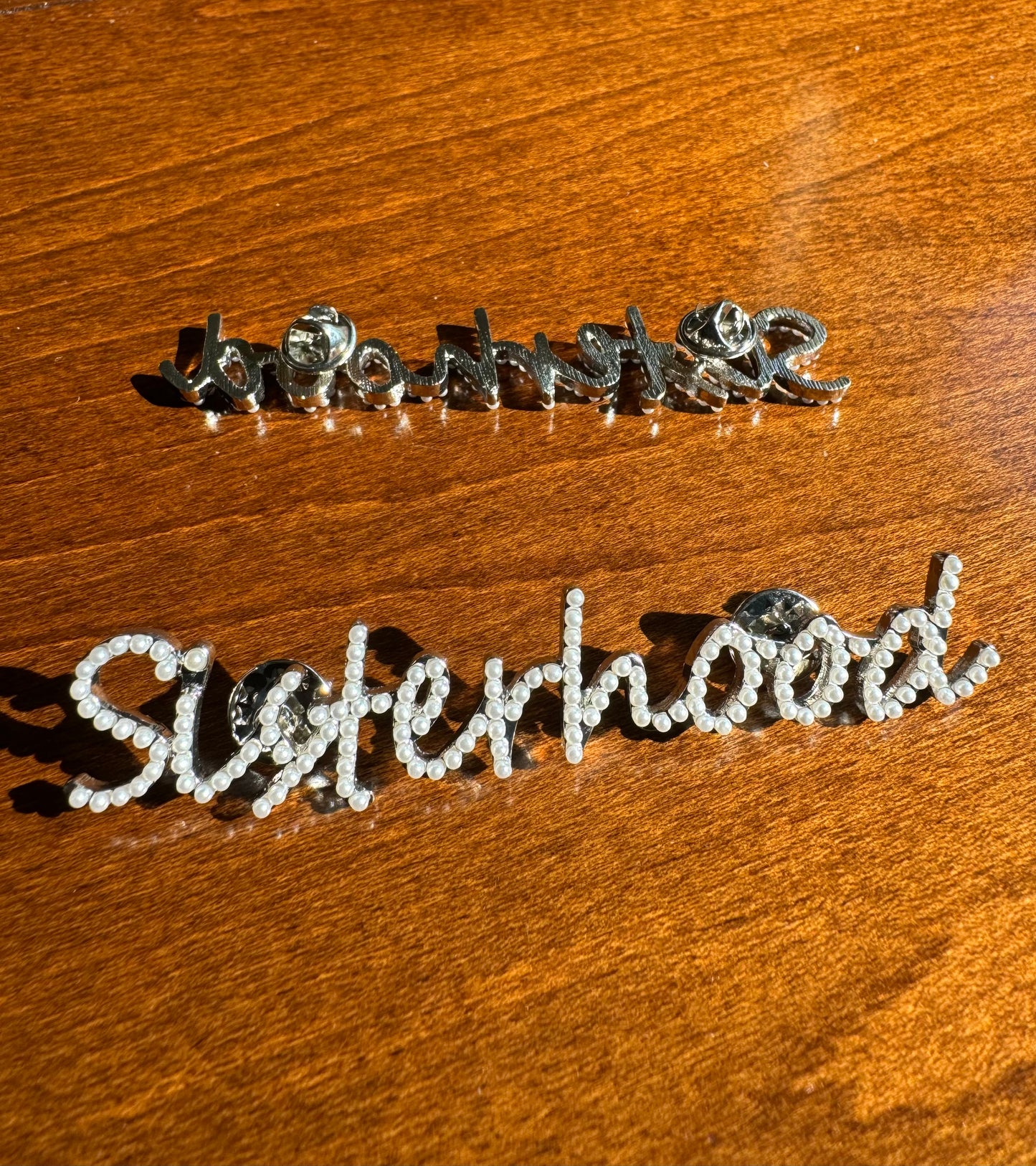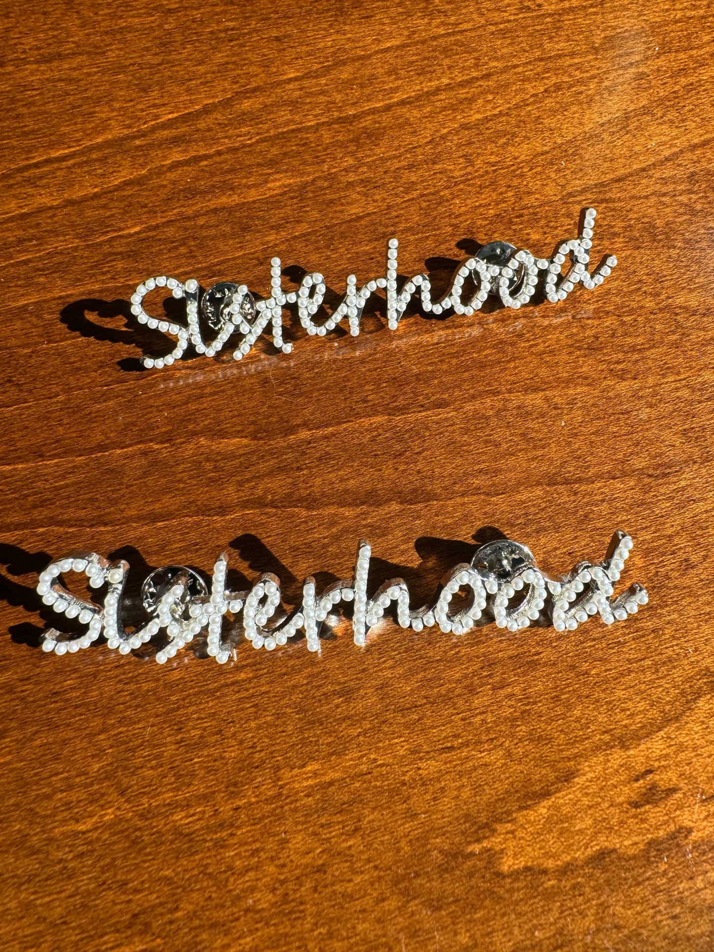 Large 3 inch “Sisterhood” lapel pin is nicely weighted and beautifully crafted. Available in all Pearls and has 2 butterfly clasps in the back to attach to your clothing.