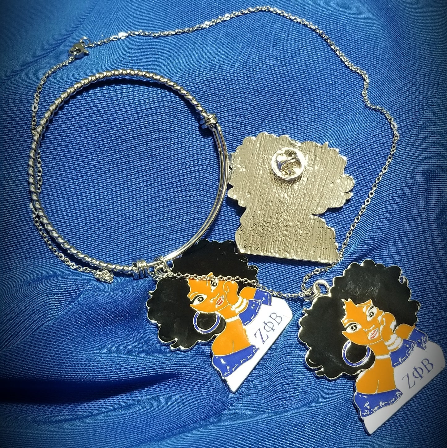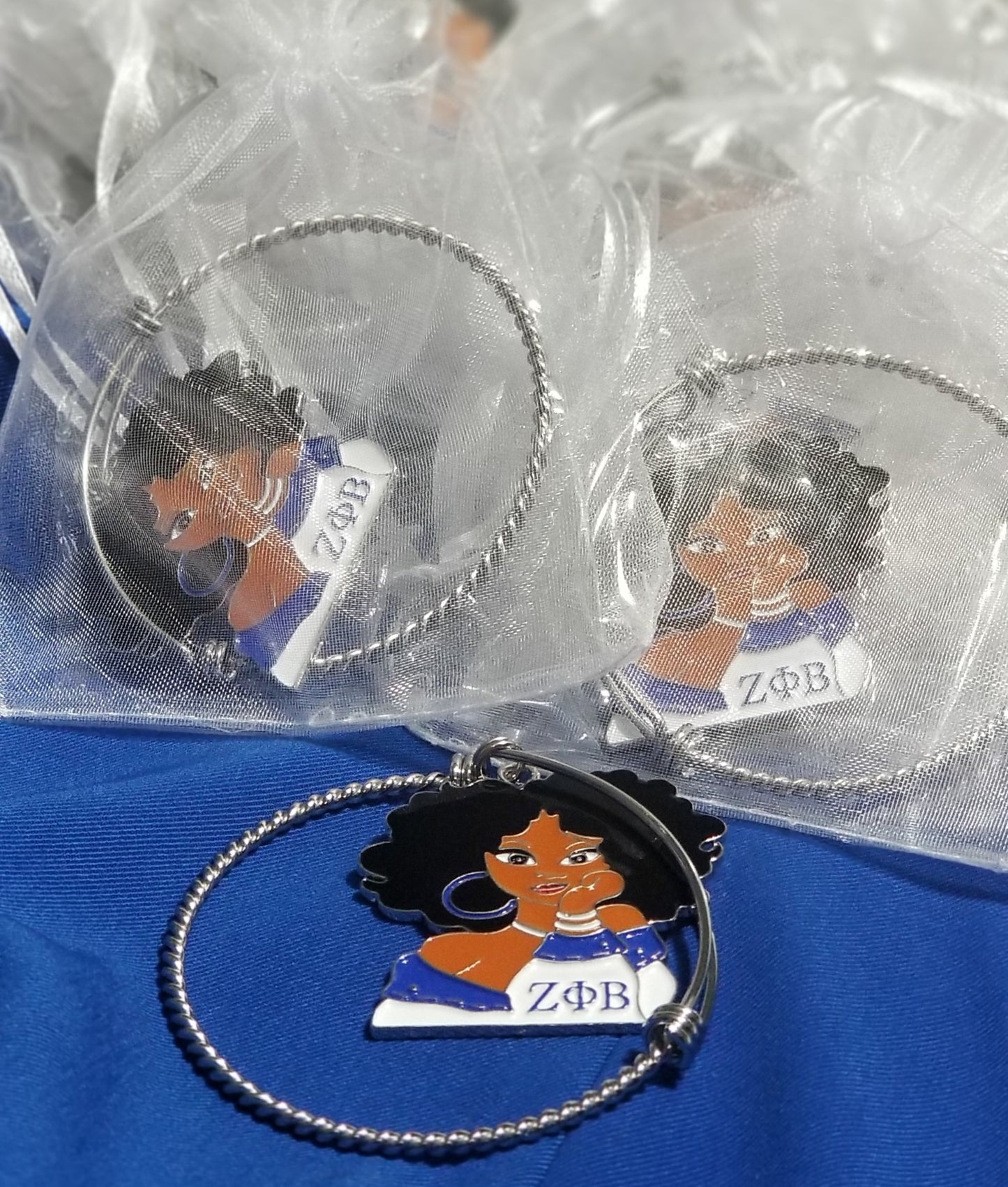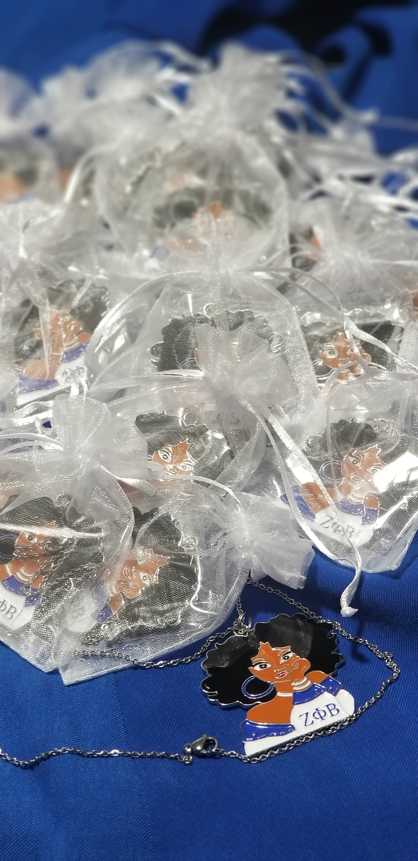 Soror Girl charm available on a Stainless Steel bracelet, as a necklace on an 18 inch stainless steel link chain or as a lapel pin. Options, options, options!