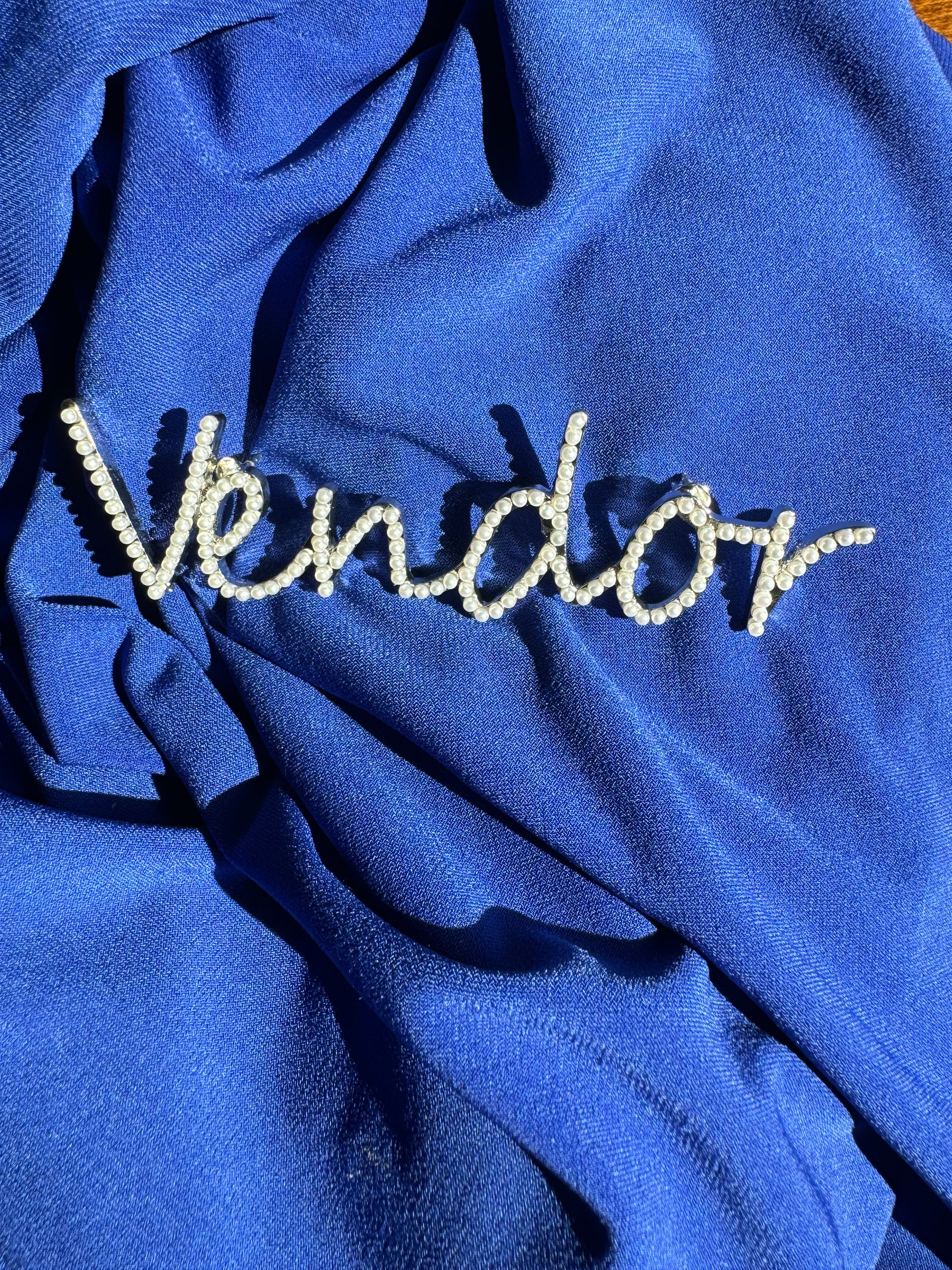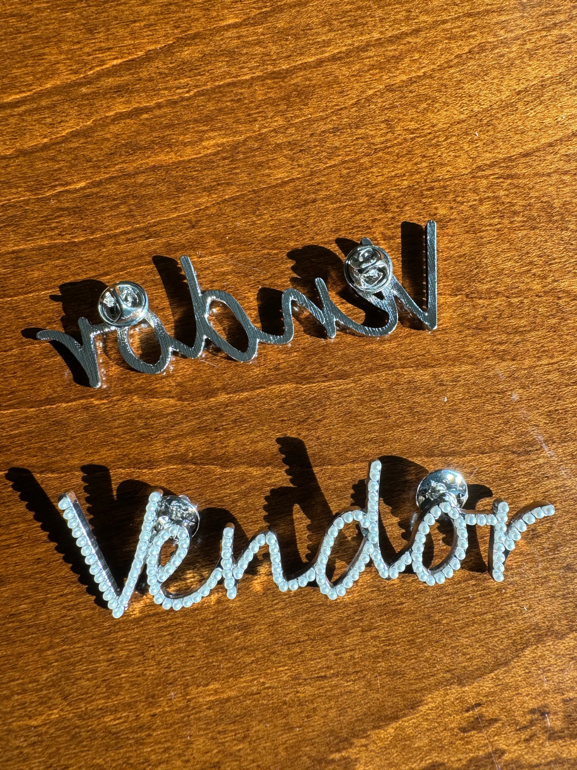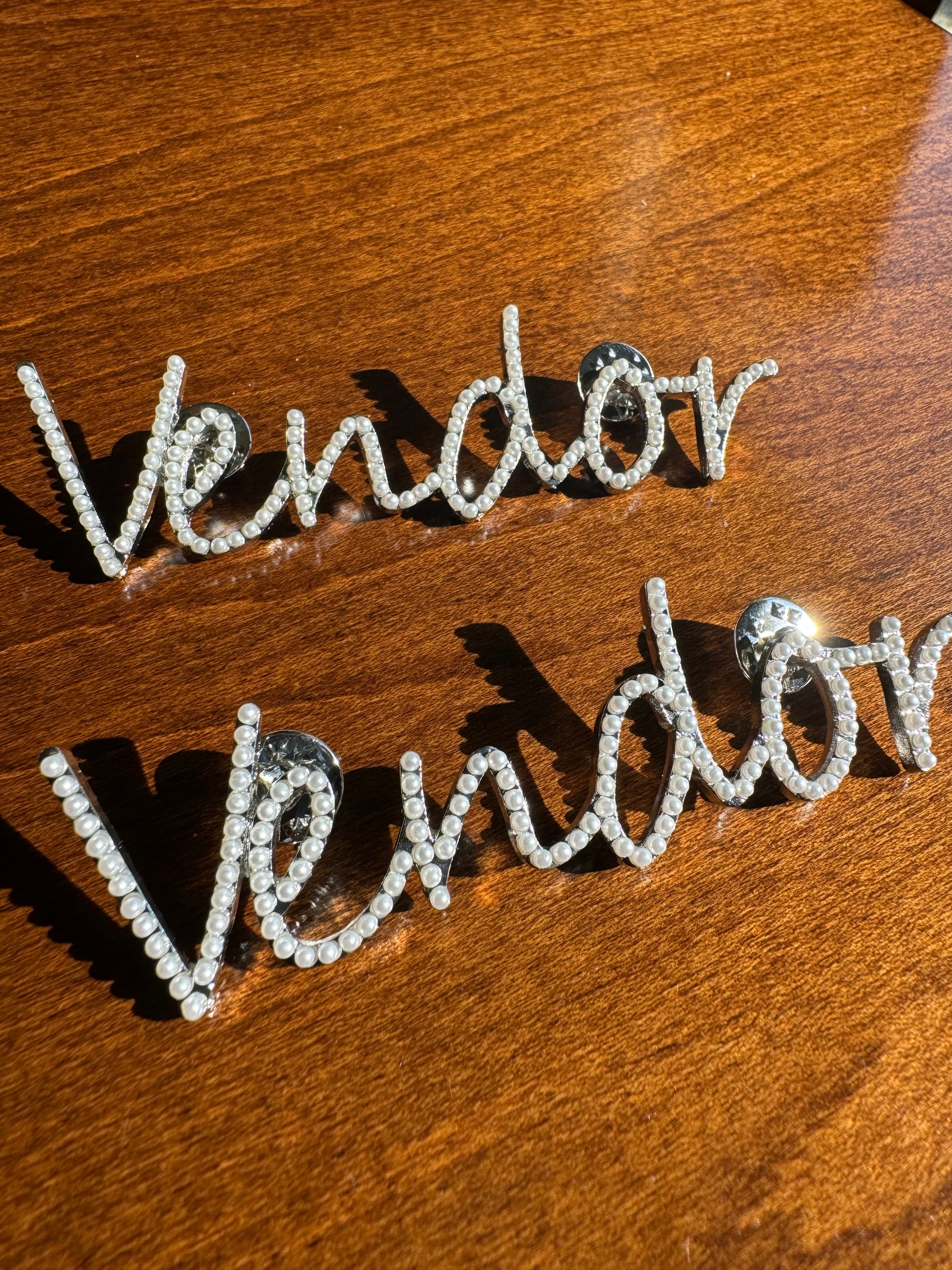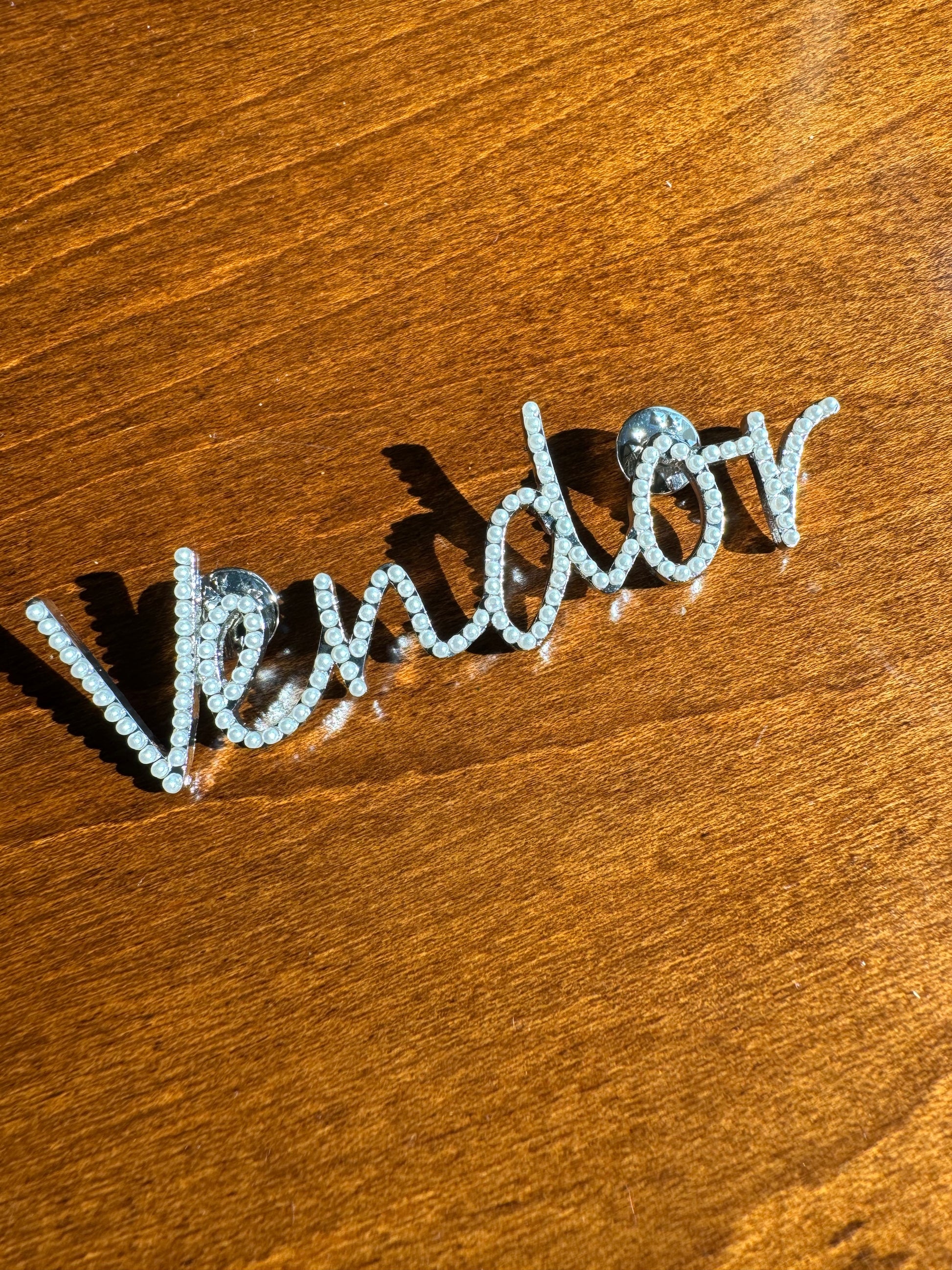 Large 3 inch “Vendor” lapel pin is nicely weighted and beautifully crafted. Available in all Pearls and has 2 butterfly clasps in the back to attach to your clothing.