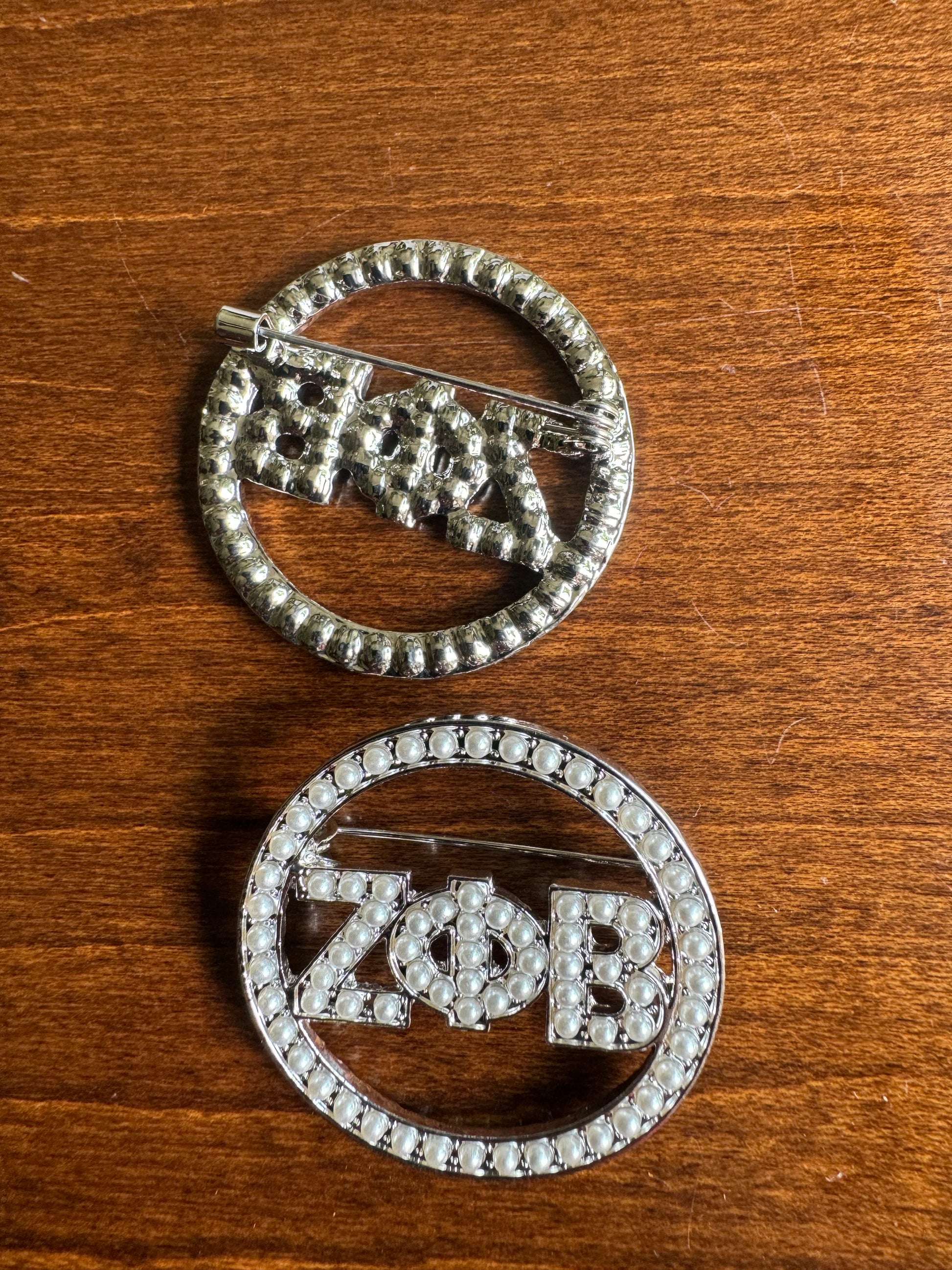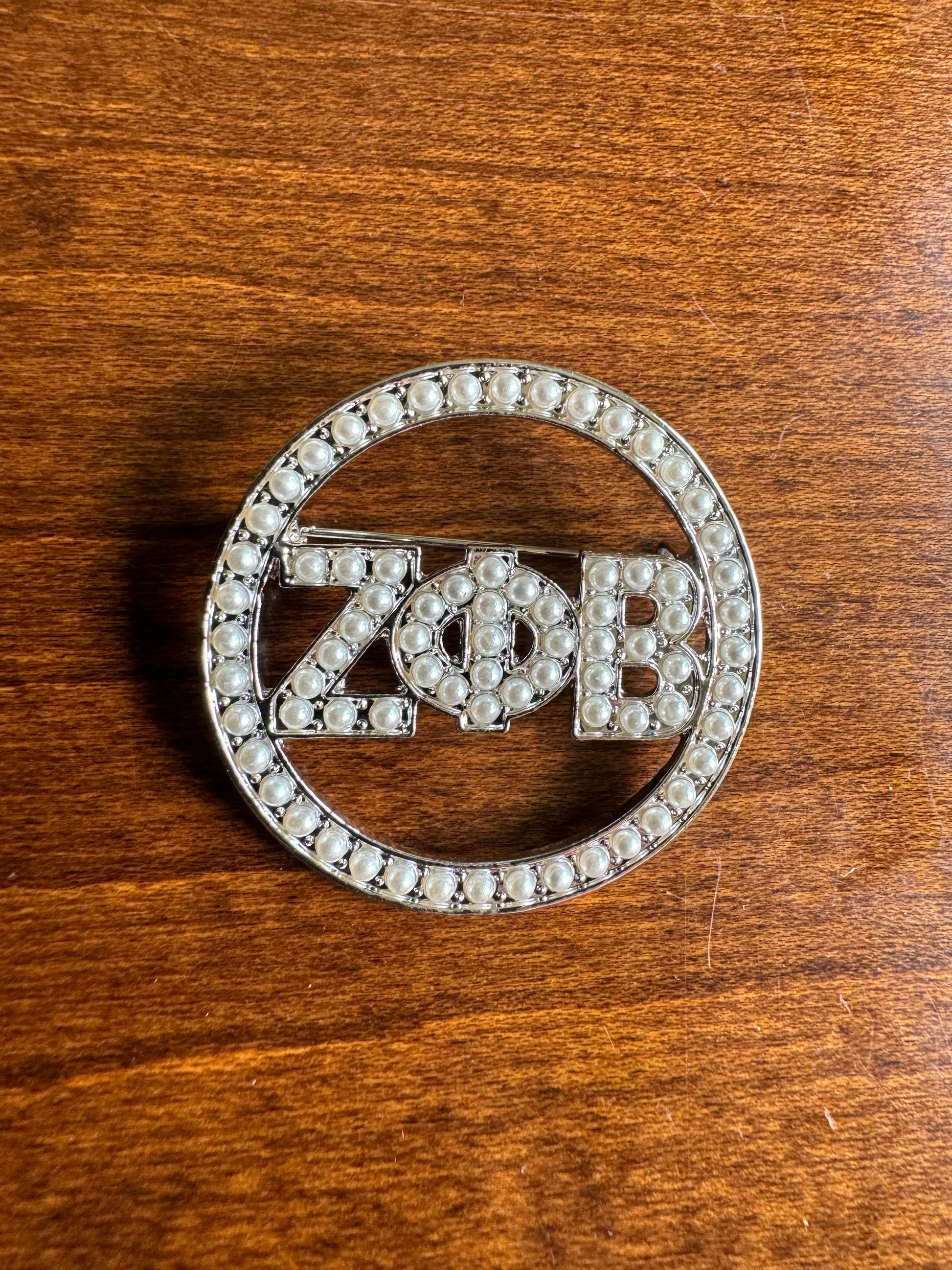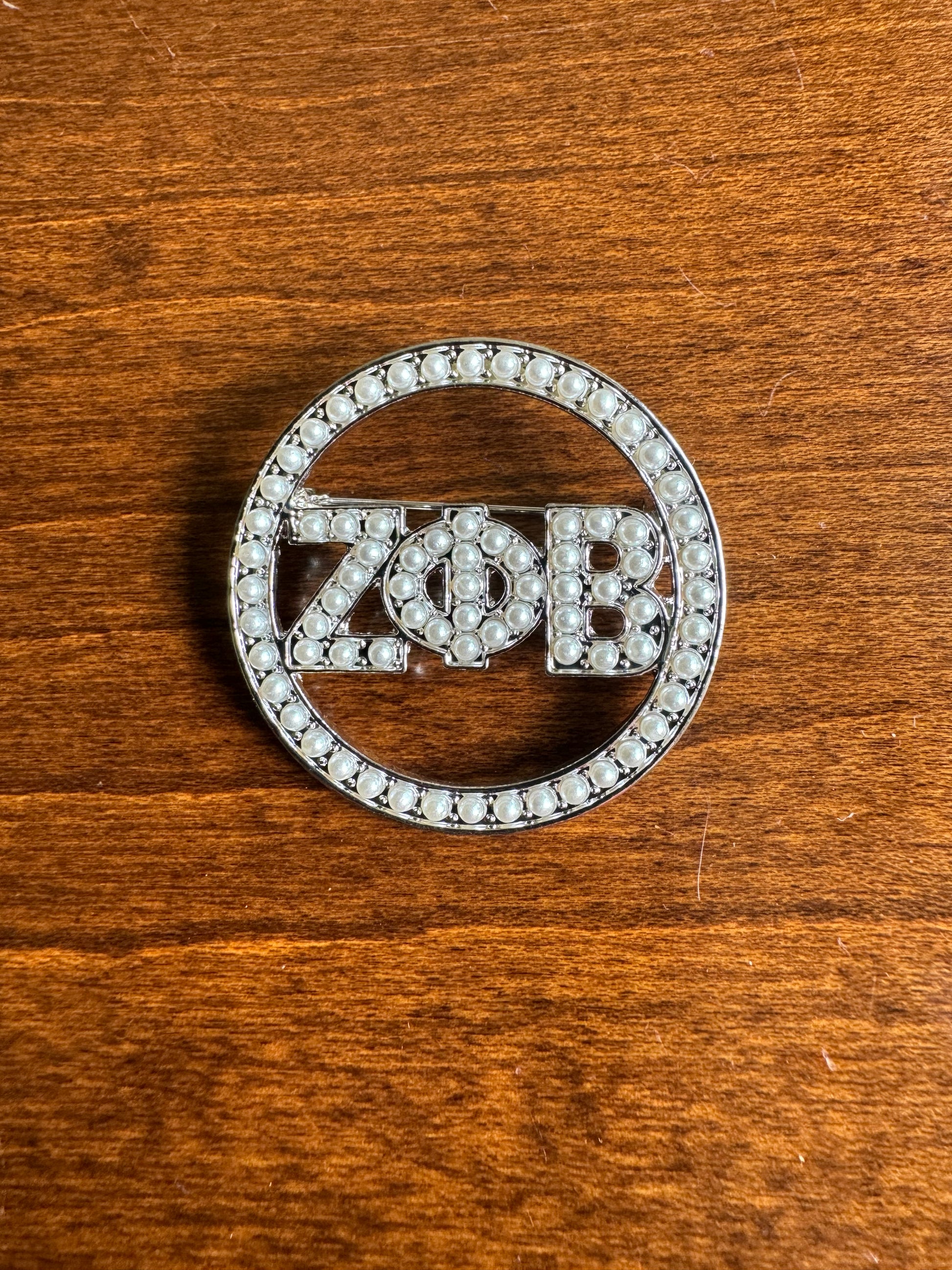 Beautiful circle pearl pin with Zeta Greek letters in the center.